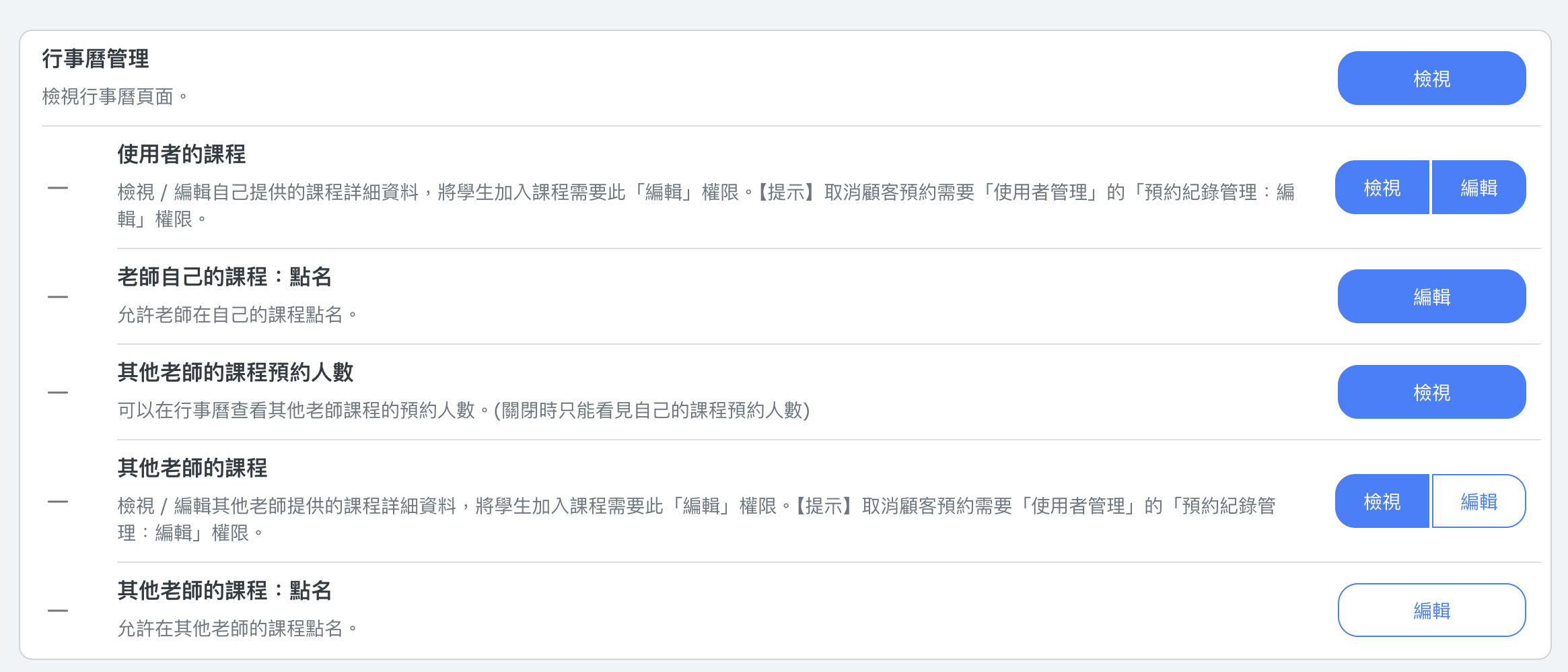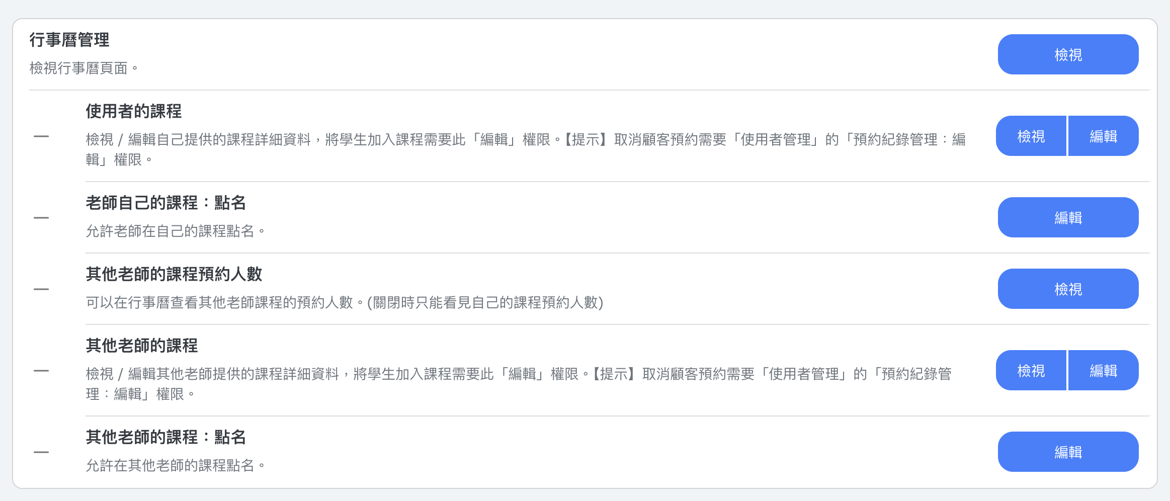 商家可以透過行事曆管理權限來控制指導者在行事曆上可以看到的內容。這些權限決定指導者是否可以查看或編輯行事曆上的課程、進行點名,以及是否可以存取其他指導者所教授課程的資訊。