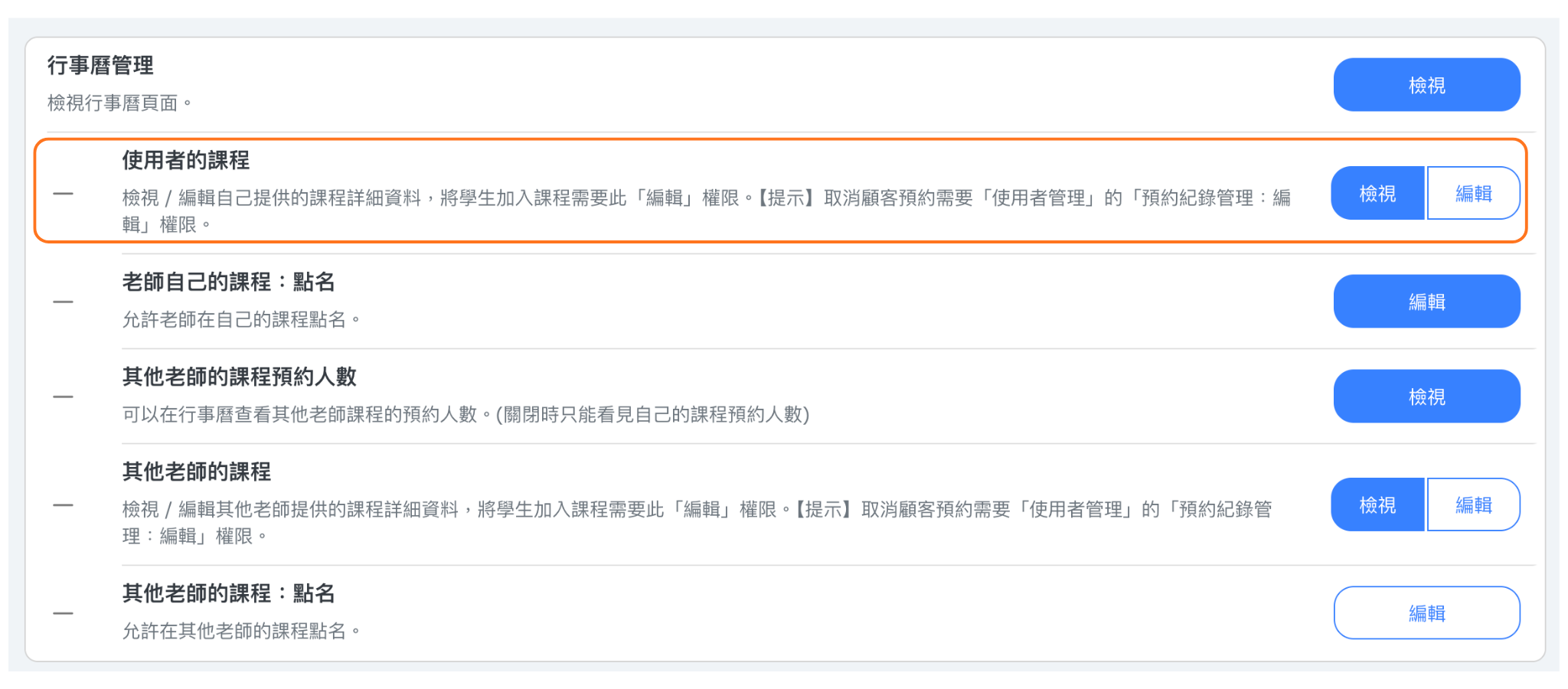 | 其他指導者的課程:編輯 | 指導者可以編輯行事曆上的所有課程,包括指派給其他指導者的課程。 |