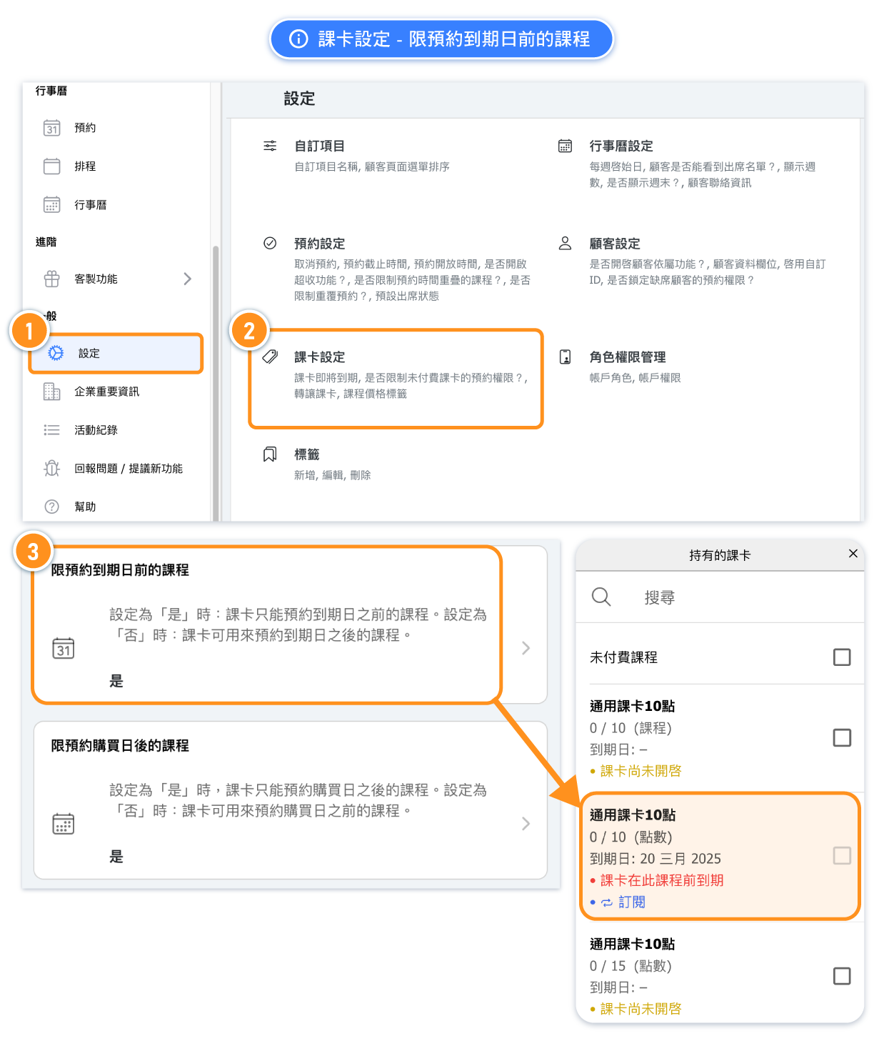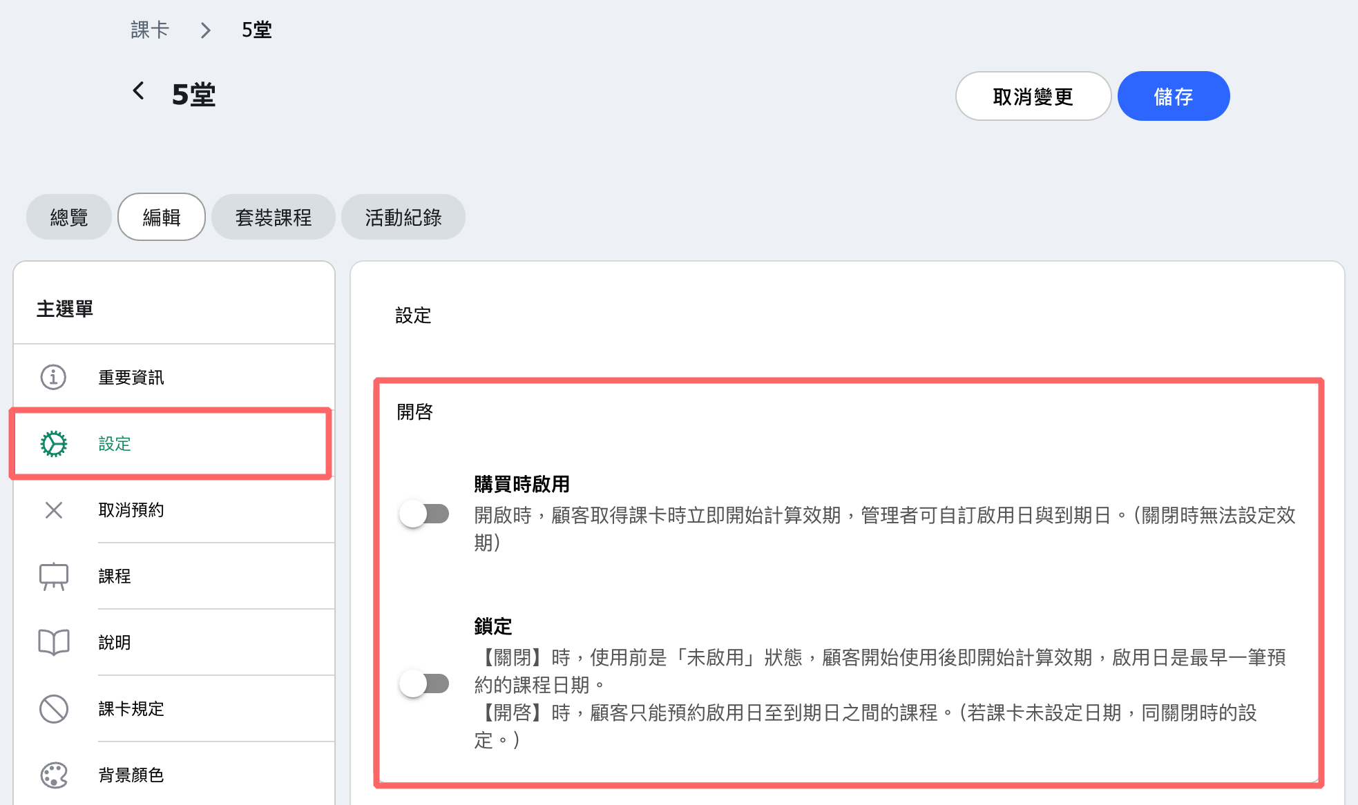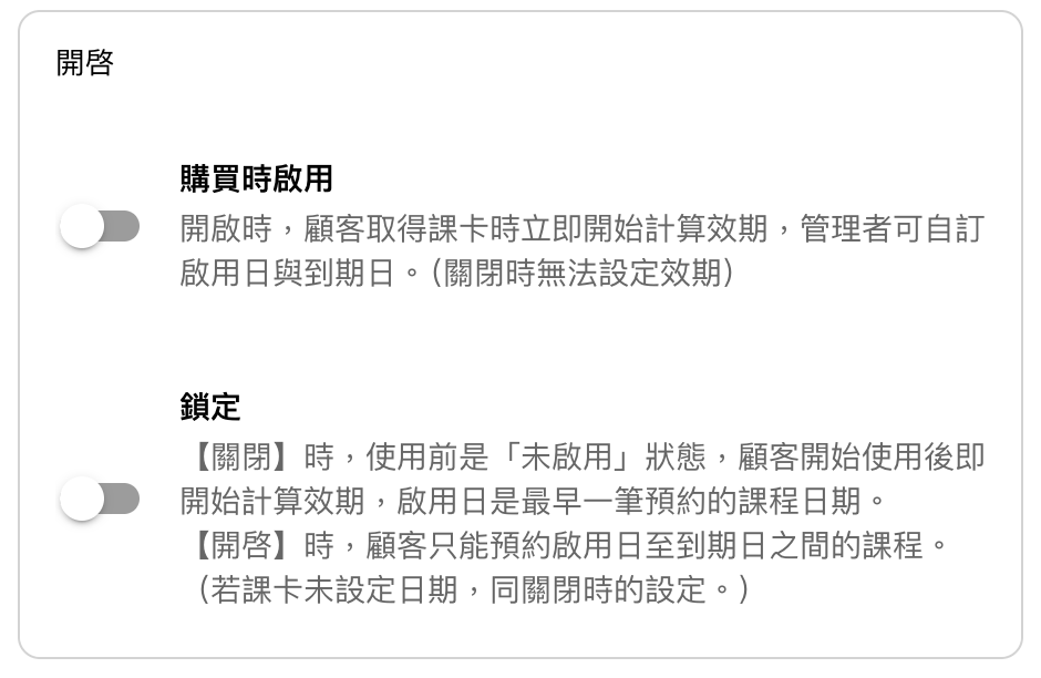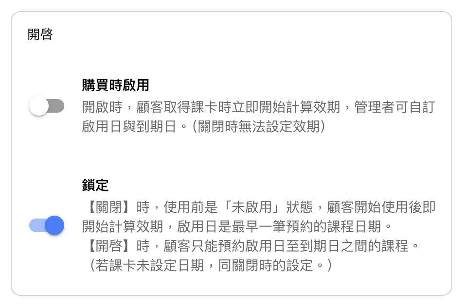 售出的課卡設為「鎖定」,管理者設定啟用日與到期日,顧客只能預約啟用日至到期日之間的課程。
