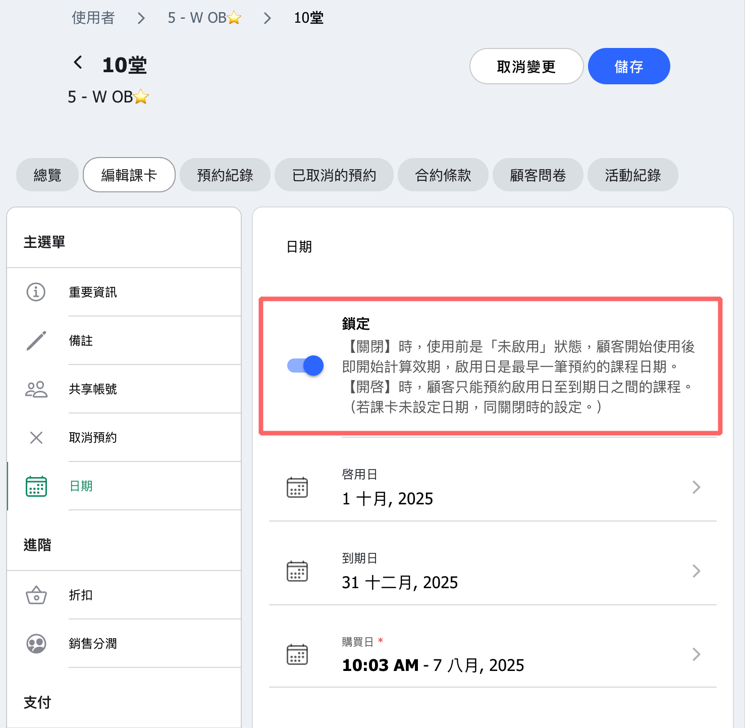 預售課卡若要限制顧客可預約的課程日期範圍是在未來特定期間,在設定好啟用日與到期日後,請務必開啟「鎖定」功能。有鎖定才能限制使用效期,