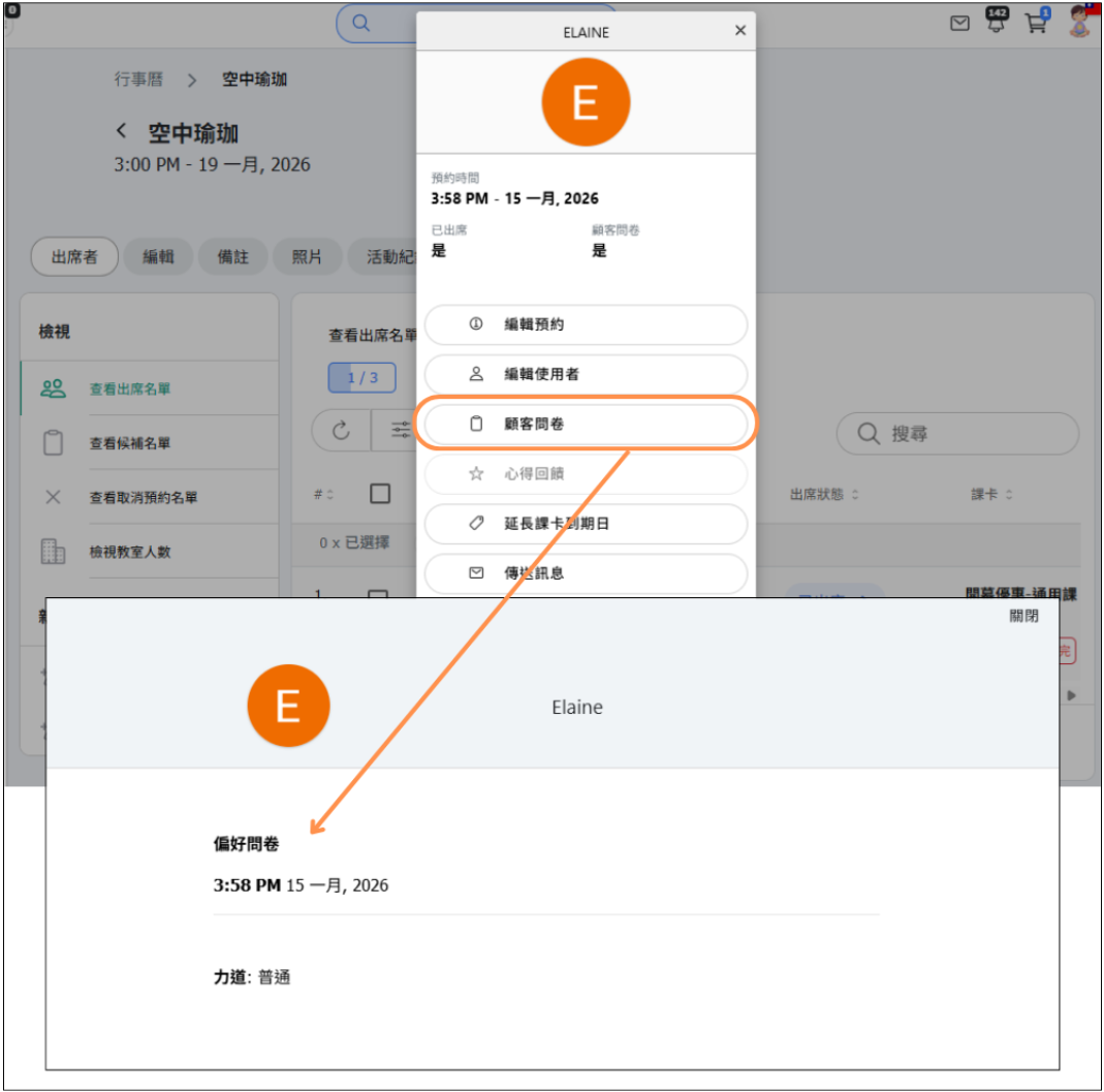 - 顧客使用有問卷的課卡預約,或課程有綁定問卷,可以在預約紀錄查詢到顧客問卷填寫紀錄