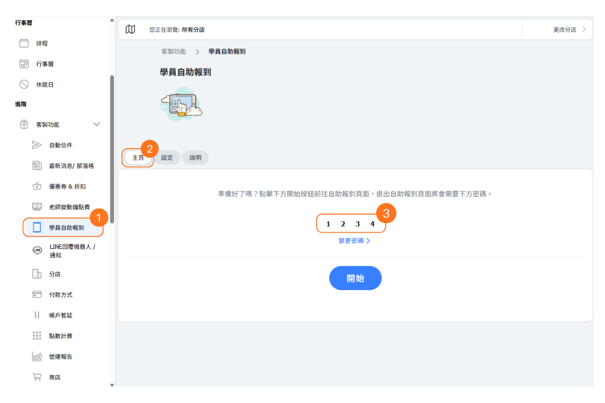 前往客製功能 > 學員自助報到,點擊「更改密碼」設定新密碼。
