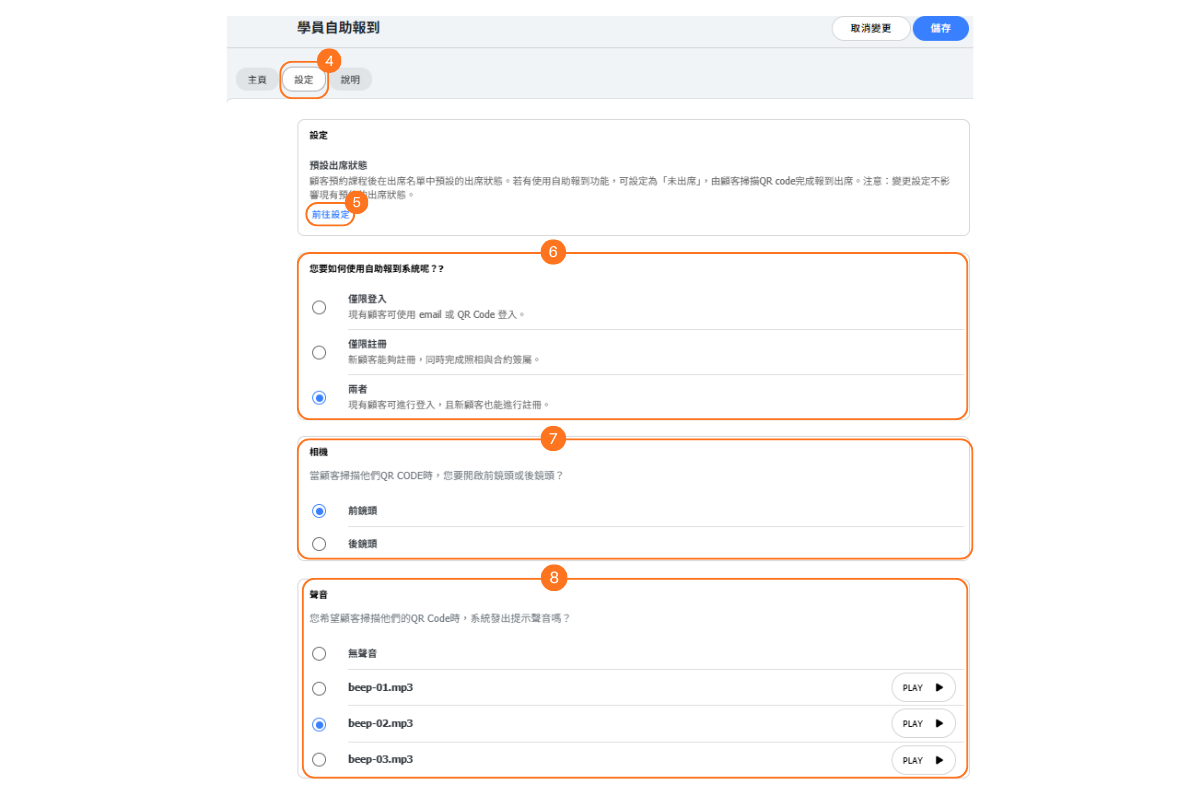 為了讓自助報到與出席追蹤正常運作,您需要配置預約設定:
