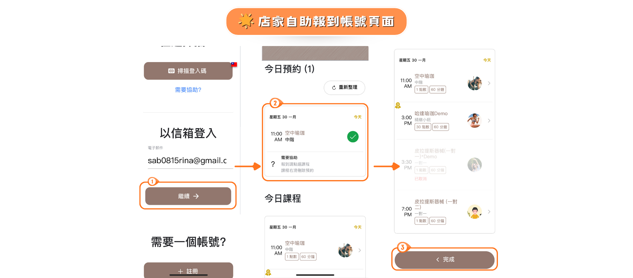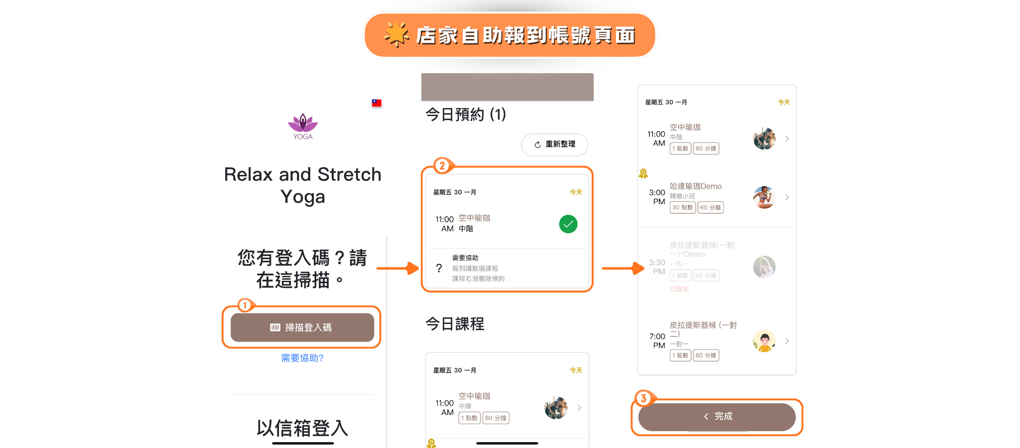 學員自助報到是一項自助服務功能,讓您的學員可以使用工作室的專用平板或設備自行報到上課。學員無需工作人員手動點名,可以: