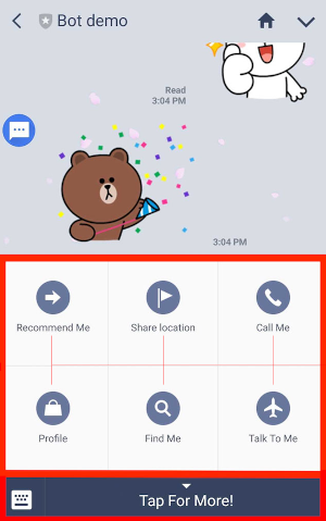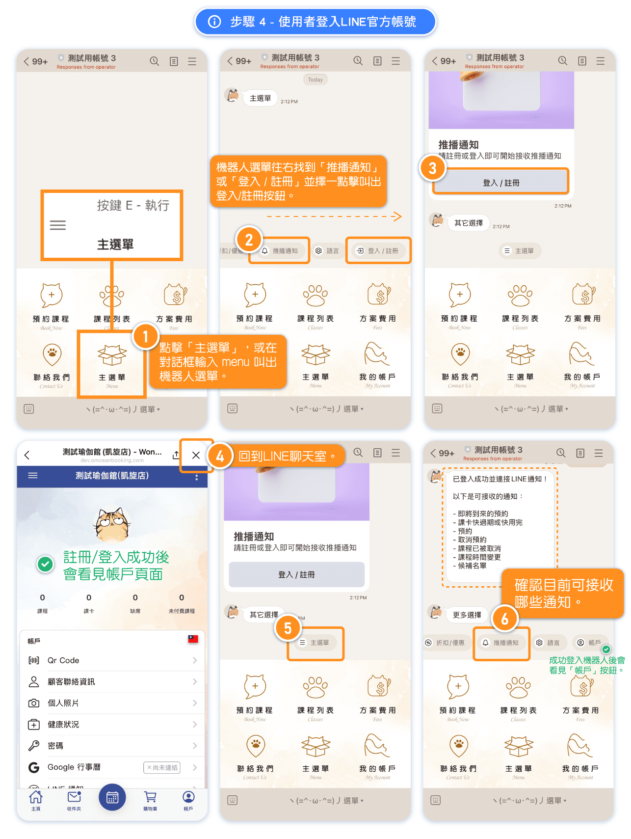 其中一個按鈕必須設定「主選單」或「通知」,或其他連接系統內資料的按鈕選項(如「課程、課卡、指導者、商店」等),這樣使用者點擊該按鈕時,就可以叫出機器人選單,或直接叫出連接通知的內容,透過機器人選單登入就能把自己的個人LINE帳號與LINE機器人連接起來,就可以收到機器人傳送的通知了。