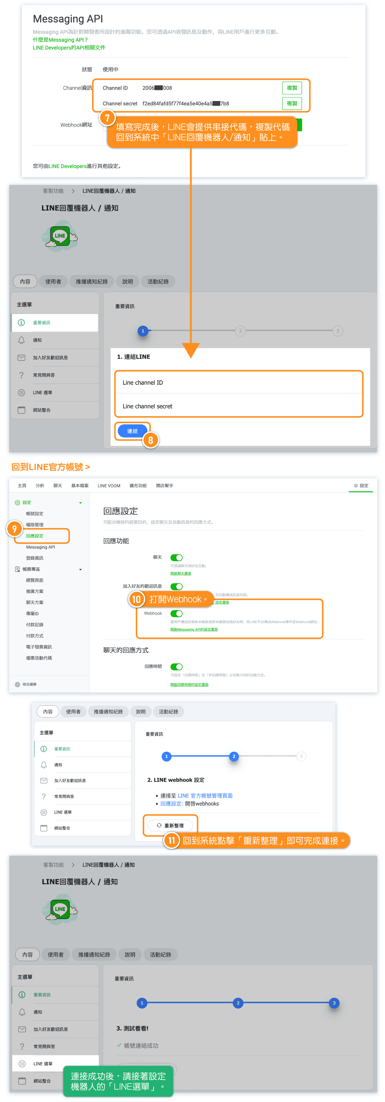 Messaging API 裡串接代碼有兩串,分別是 Channel ID 和 Channel secret,貼到預約系統上並儲存,回到LINE官方帳號打開Webhook開關,就連接完成了。