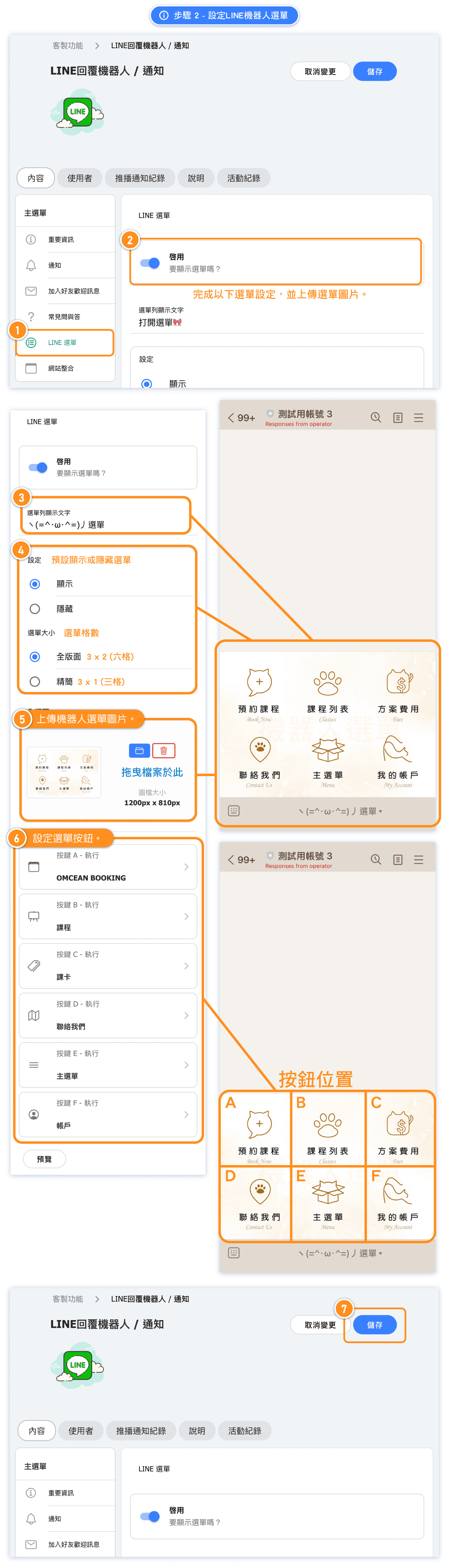 串接上之後,開始設定機器人選單,上傳設計好的選單到系統上,並設定按鈕功能後儲存。