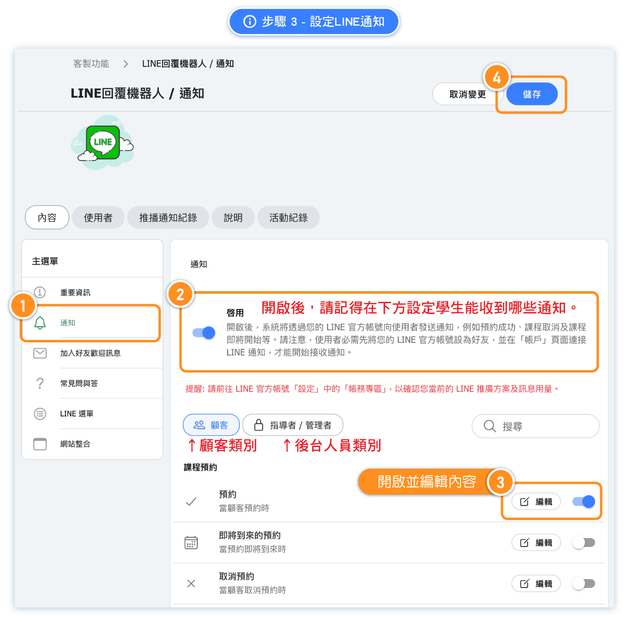 如果希望利用LINE機器人傳送通知,管理者要打開通知設定,選擇想要傳送到哪些通知給使用者並儲存。