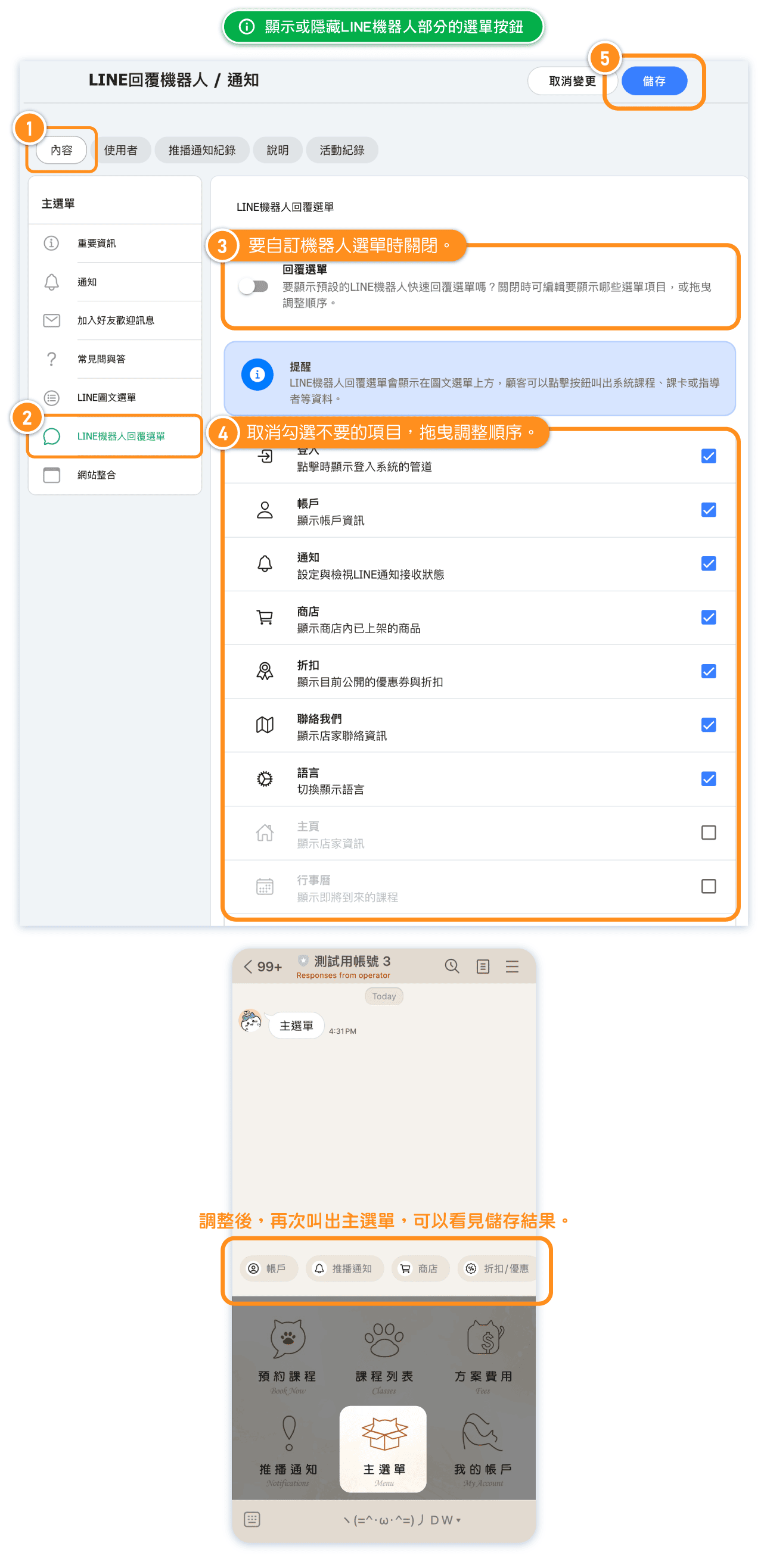 您可以在「LINE機器人回覆選單」選擇隱藏部分LINE機器人的選單項目,也可以拖曳調整項目的順序。