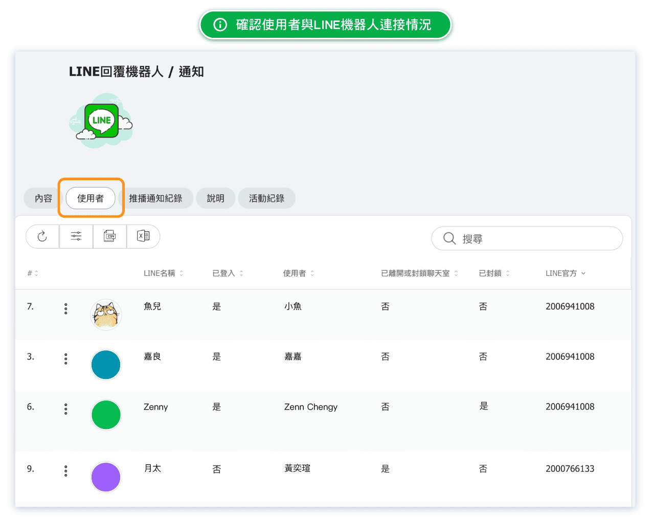 在LINE回覆機器人的頁面找到「使用者」頁籤,裡面可以看見所有已註冊的使用者,如果使用者已經成功連接上LINE機器人,您可以在「已登入 」欄位看見「是」,並且「LINE官方」欄位顯示了您目前連接中的LINE官方Messaging API的Channel ID,代表這位顧客已經成功連接上LINE機器人與通知了。