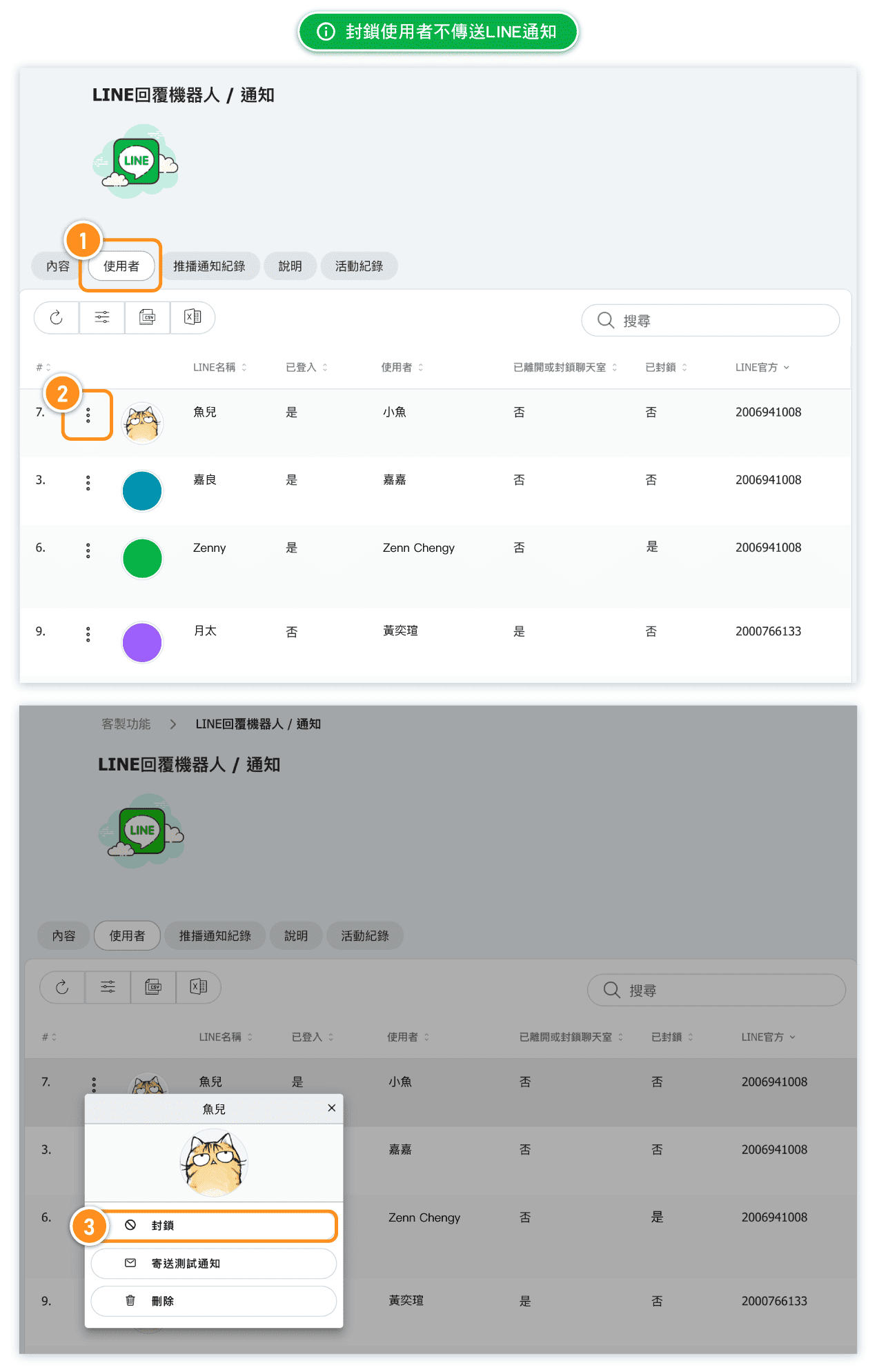 可以。在「使用者」頁面找到使用者,在左側三個點的圖示內,點擊按鈕「封鎖」,系統將不會再傳送LINE通知給該顧客。