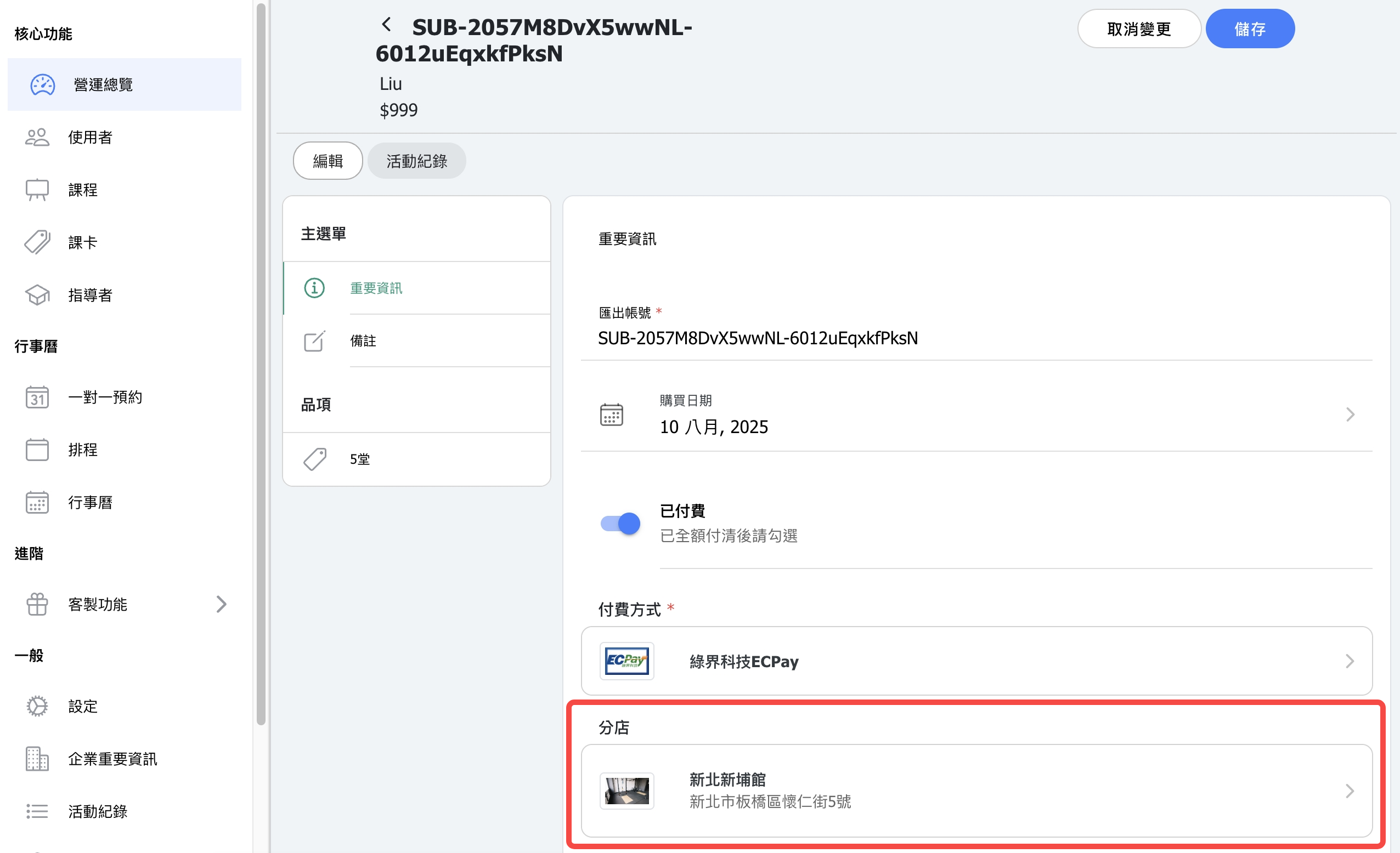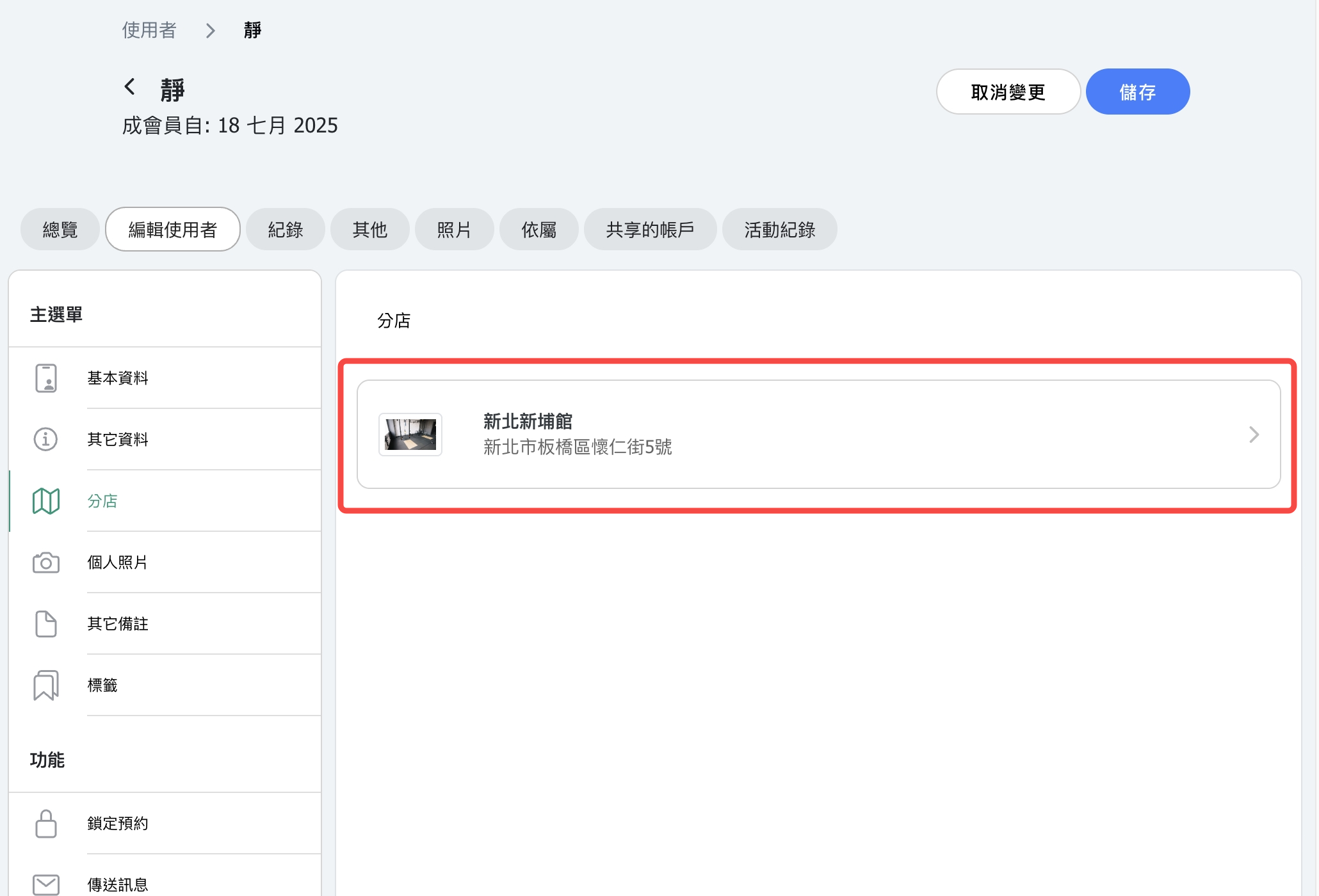 當您在瀏覽特定分店資料時,「分店」無法被更改,確保只有該分店權限的人員無法變更所屬分店。