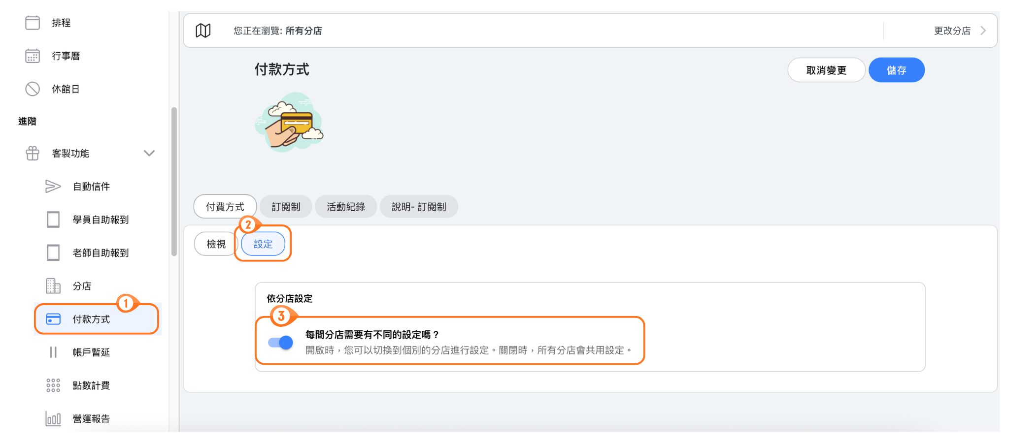 A店刷卡,B店收現金,可以嗎?可以!現在分店可獨立設定支付管道,帳務更清楚。