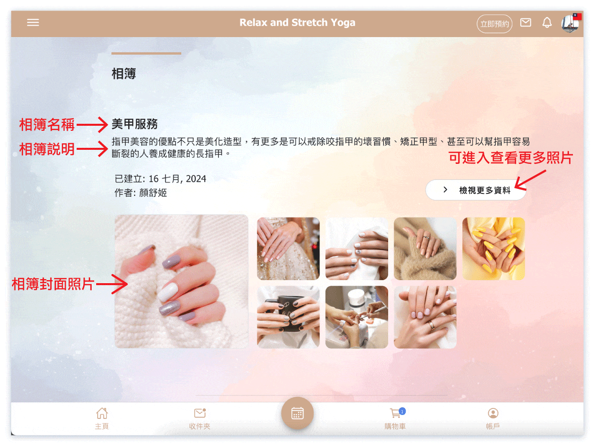 啟用後,顧客可以從您的預約網站存取您的相簿。相簿頁面將出現在您的網站導覽中。