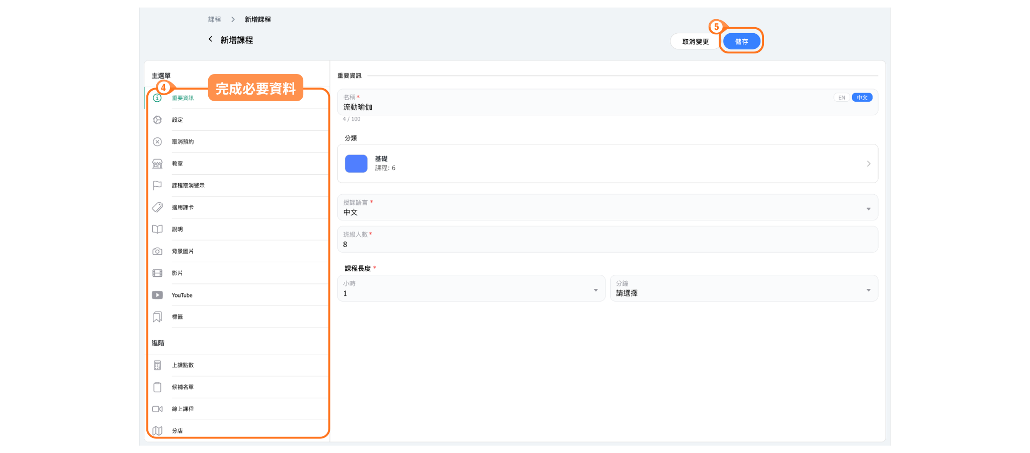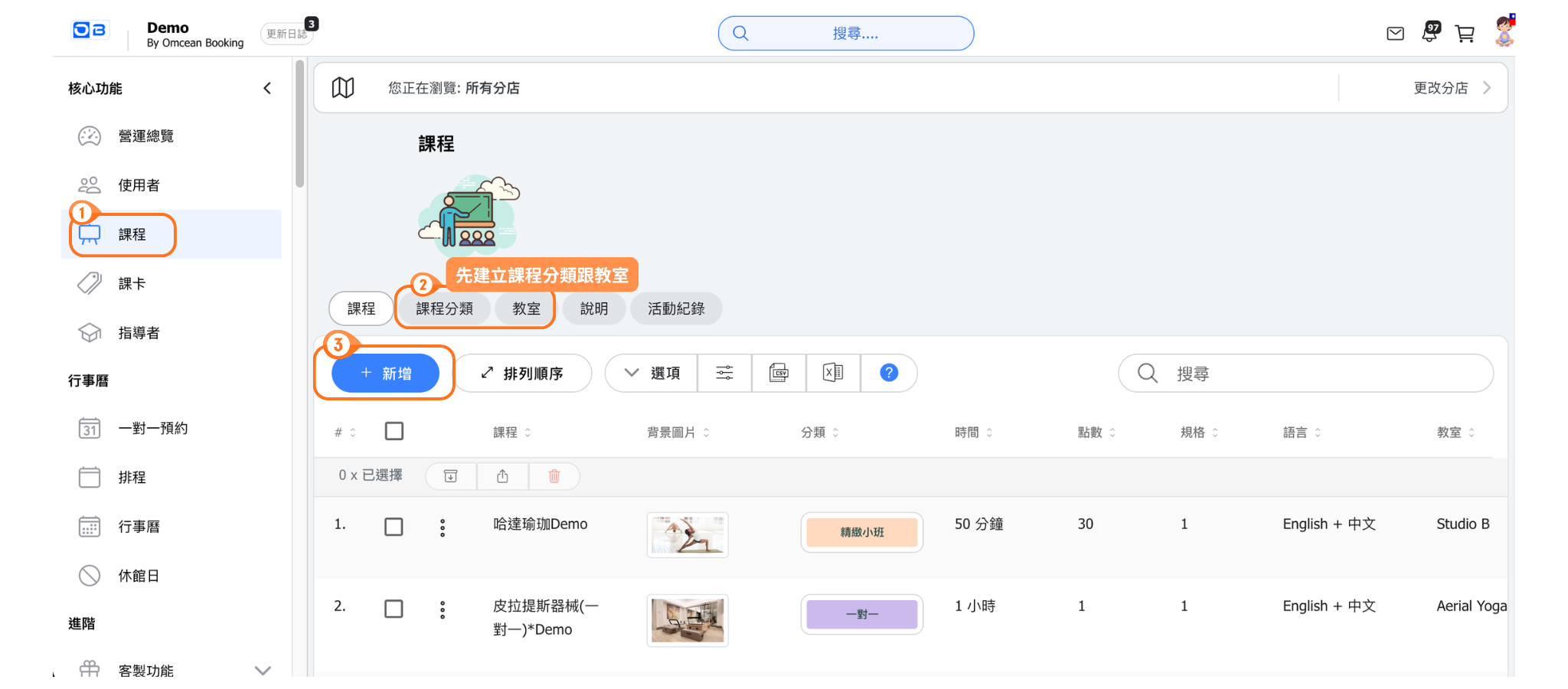 - 選擇「課程分類」和「教室」的頁籤,建立課程分類與教室