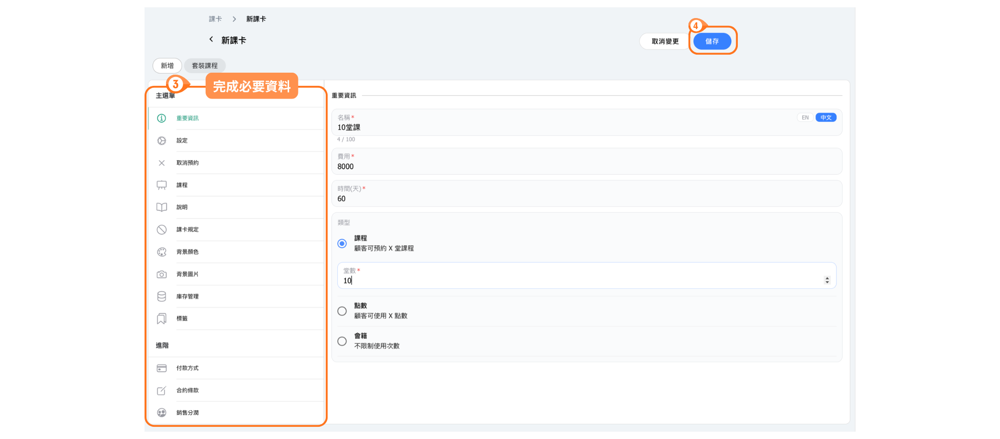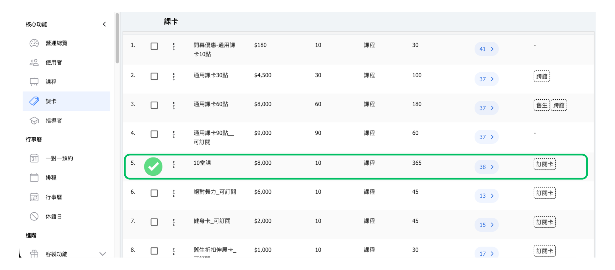 舉例來說,如果建立兩張名稱相同的「10點」課卡,第一張綁定了流動瑜珈課程,第二張沒有綁定,即使顧客取得了第二張課卡,這張課卡叫作「10點」,但這張課卡的設定上沒有綁定流動瑜珈課程,因此無法用來預約這項課程。