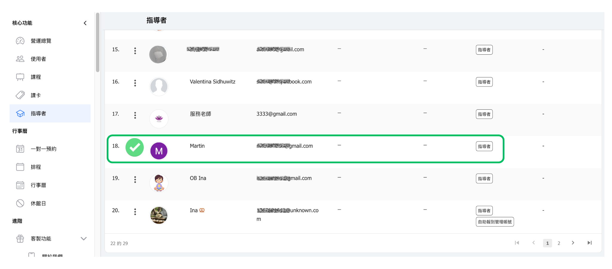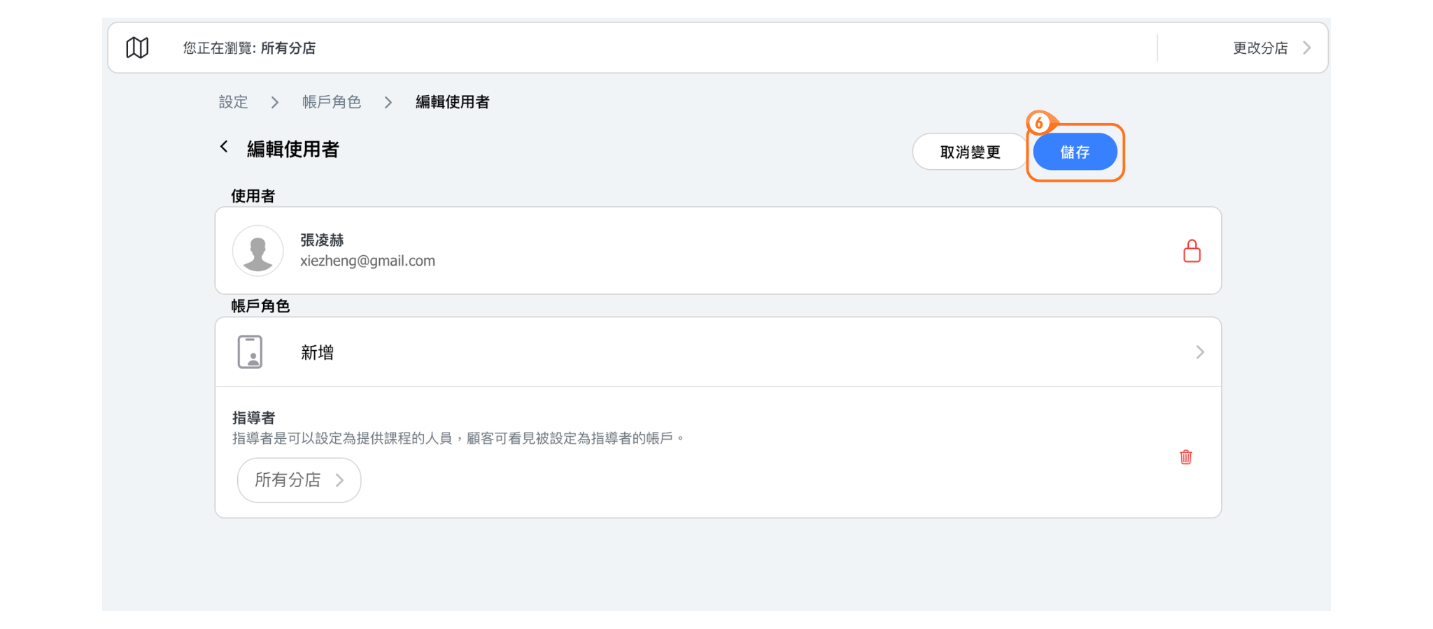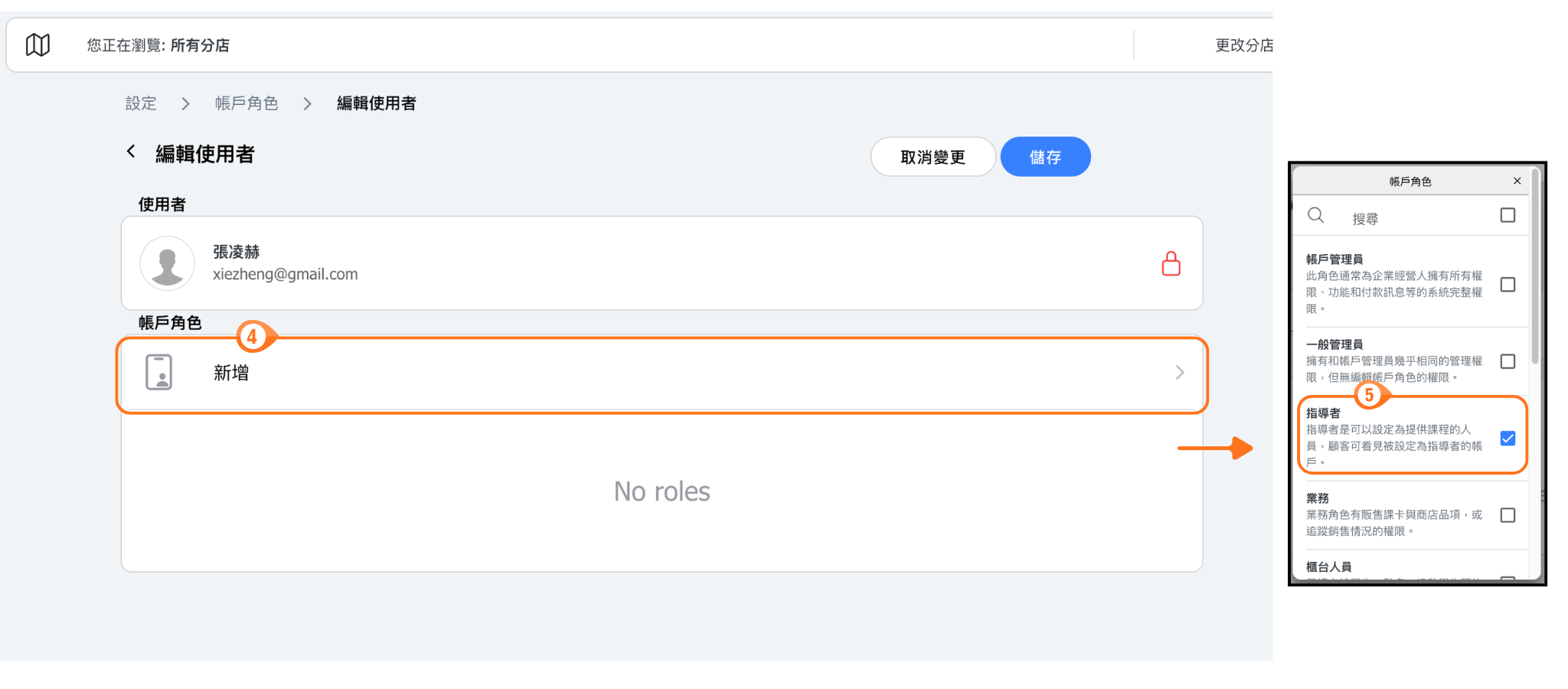 💡 提示:若商家的每位指導者擁有不同的權限時,可以將核心角色的指導者設定為最少權限,再新增多個自訂角色並分別設定不同的權限。根據每位老師的授權「核心角色 - 指導者」+「不同的角色」。