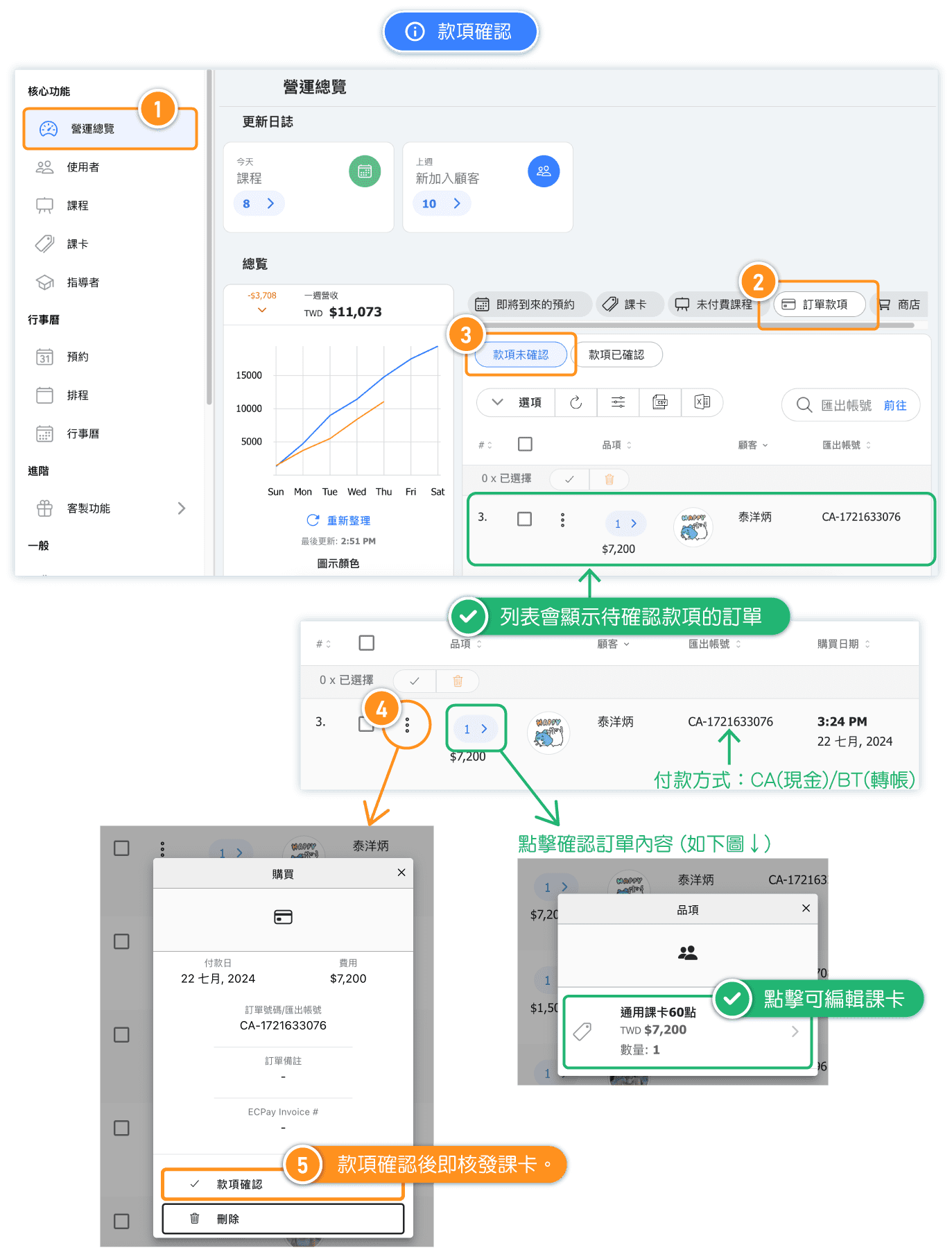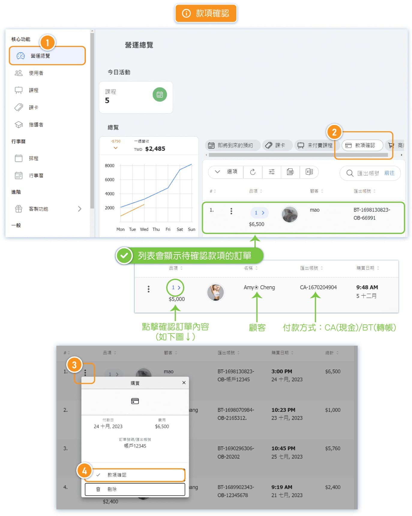 - 管理者款項確認:管理員確認收到款項後,在「營運總覽 → 訂單款項 → 款項未確認」針對該筆訂單按【款項確認】,確認後課卡將會立即核發給顧客用來預約。