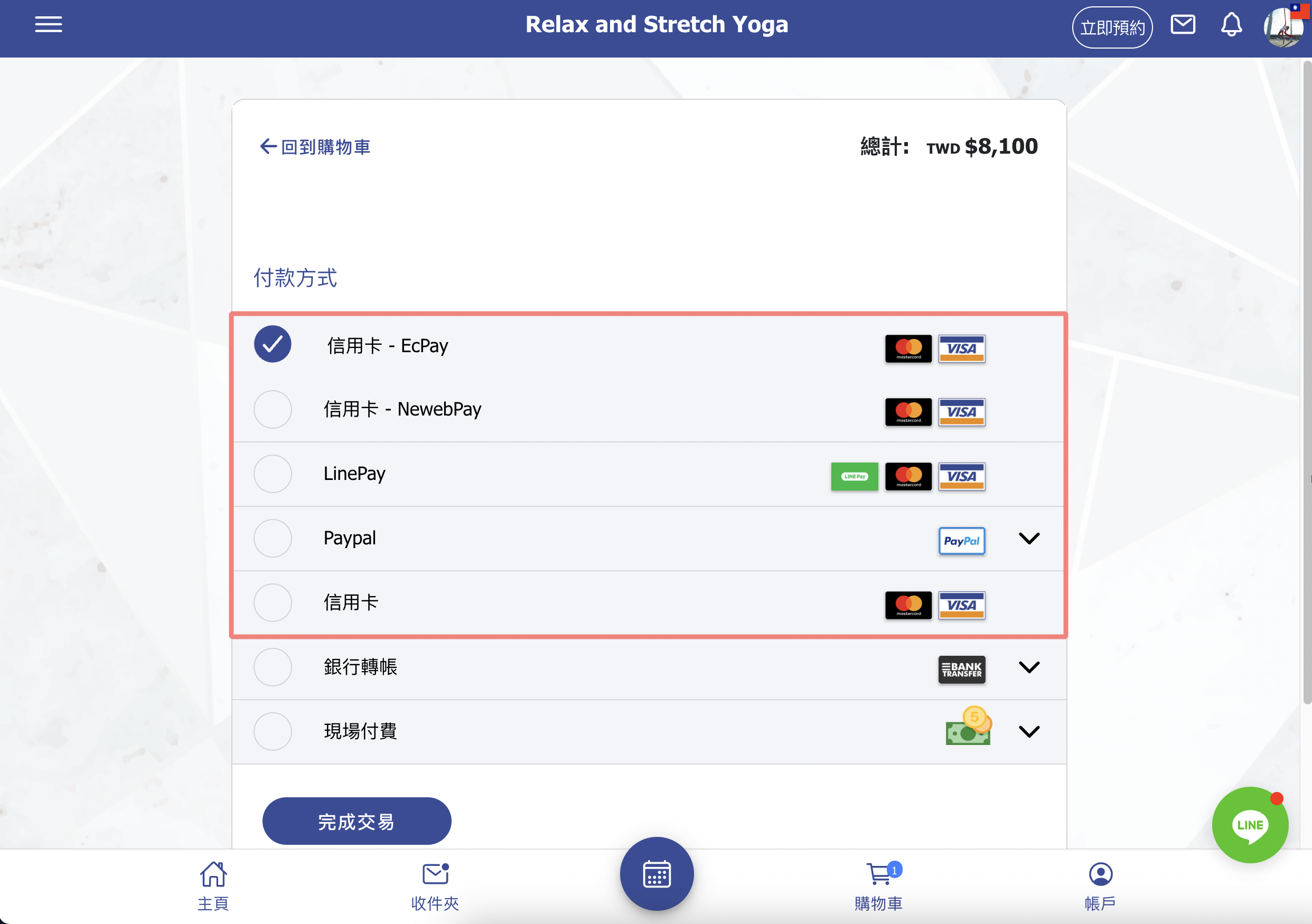 - 顧客下單:顧客在購物車結帳購買課卡,選擇「教室付款」或「銀行轉帳」。