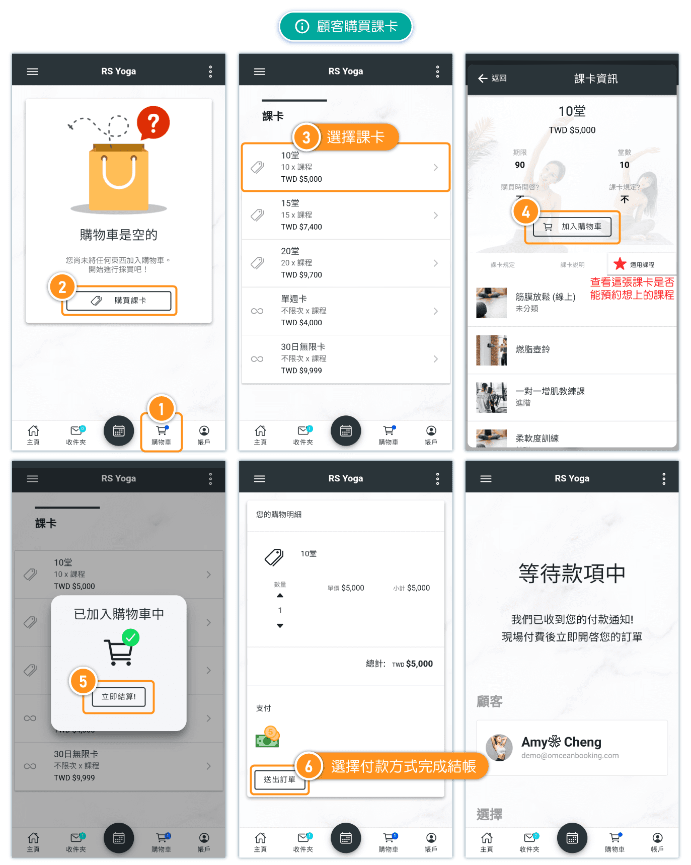 當顧客在預約網站下單購買課卡,結帳時選擇「教室付款」或「銀行轉帳」,這張課卡需要經過店家確認訂單款項後,顧客才能開始使用。