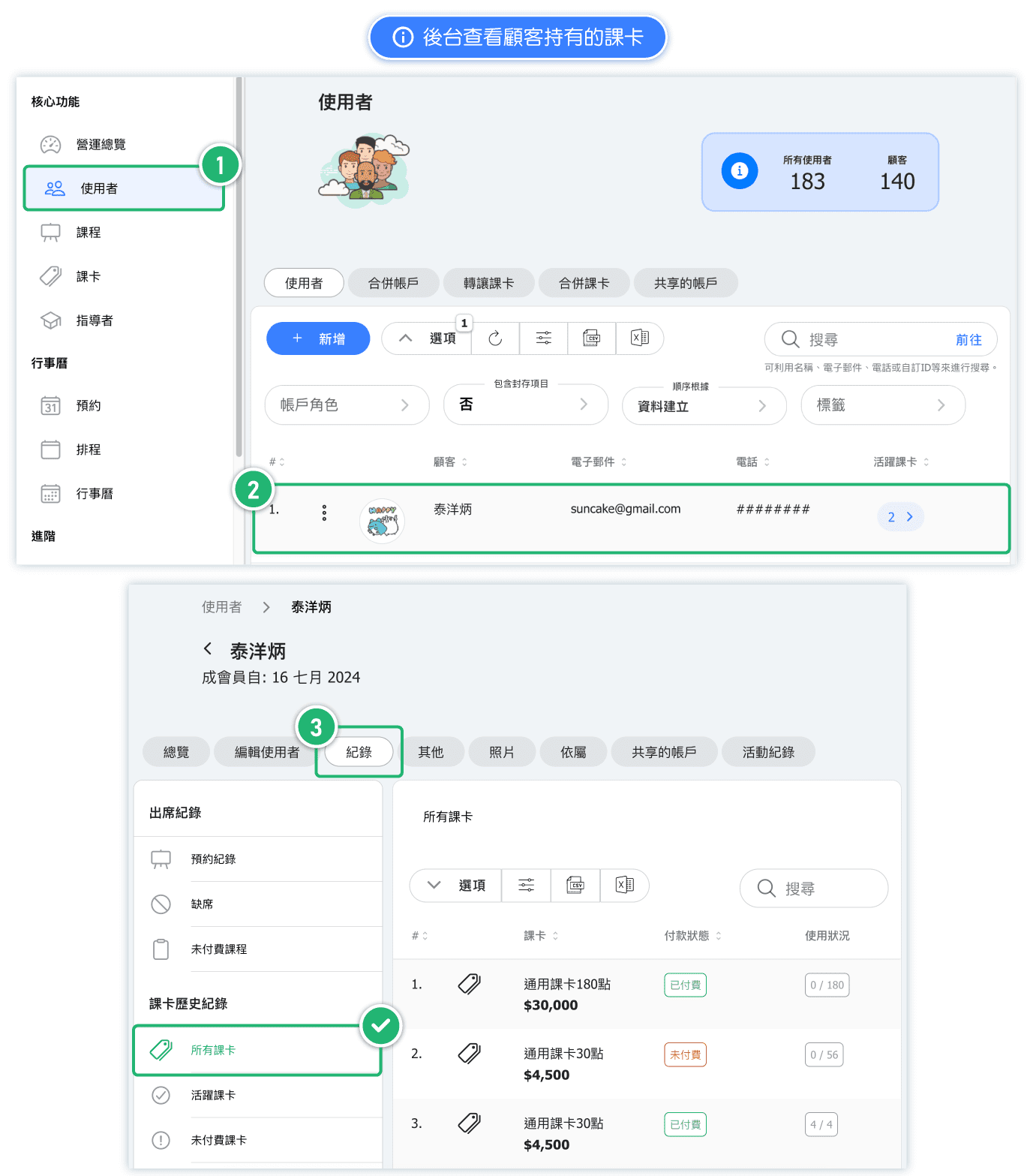 - 管理者核發課卡:管理員在「使用者」頁面使用「加入課卡」功能,將課卡核發給顧客。