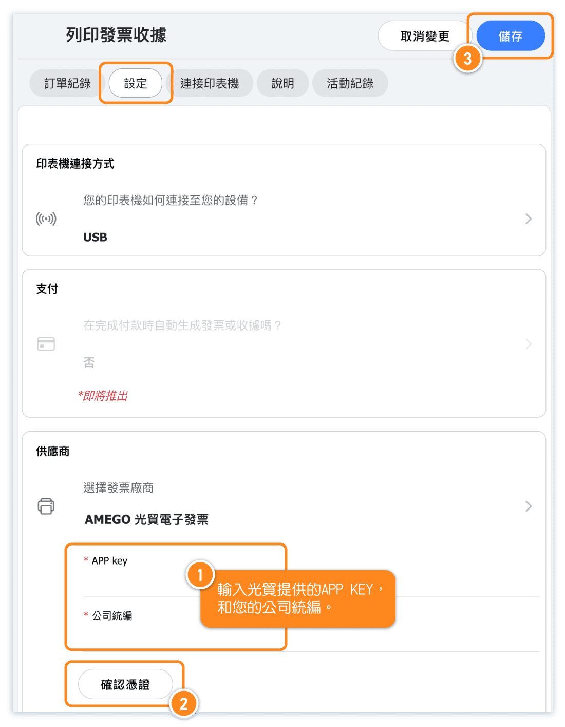 APP Key是您公司在使用Amego電子發票的專用代碼。請您先至Amego註冊帳號,並登記您的公司資料,於註冊成功後確認您公司的App Key,回到OB系統填上App Key與您的公司統編。 電子發票註冊流程 + 新增公司資料: https://invoice.amego.tw/info_detail