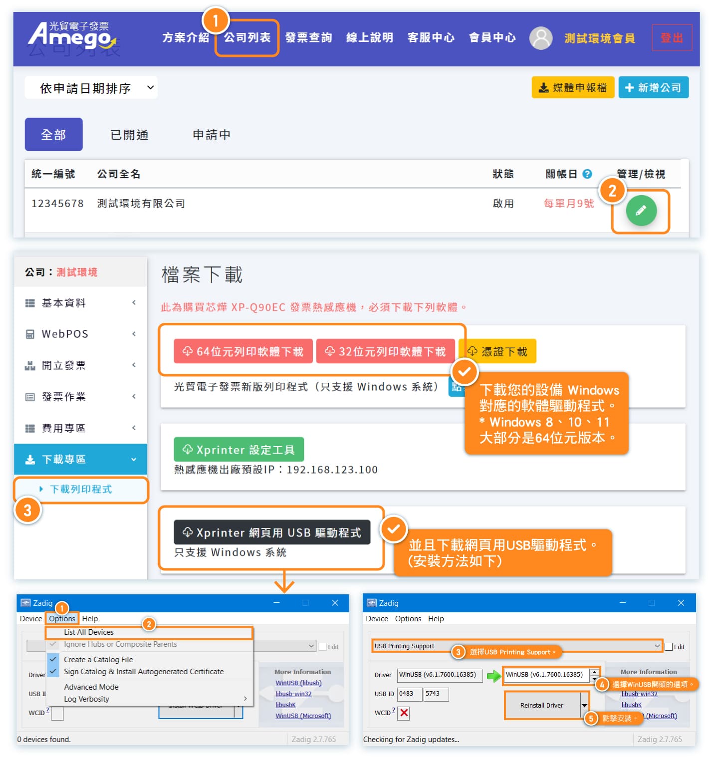 - 如果您是使用Windows系統,請先前往Amego (光貿) 官方網站,登入您在Amego註冊的帳號,下載軟體驅動程式,與網頁版USB驅動程式這兩項。(蘋果系統無須安裝驅動程式)