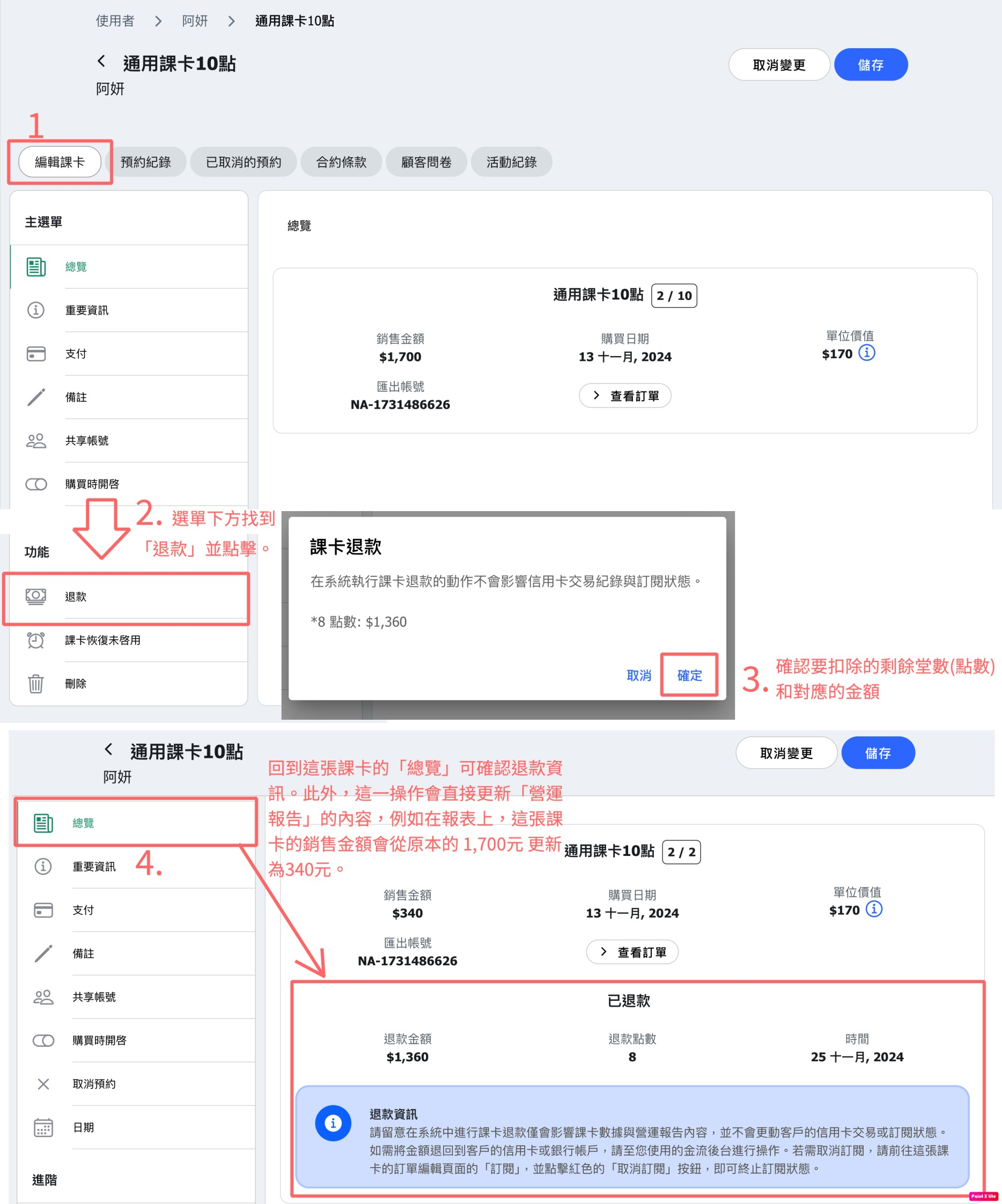 您可以在顧客的課卡頁面找到「退款」按鈕。點擊後,系統會跳出提示訊息,顯示將退還的課卡餘額與對應金額。確認後,點擊「確定」,系統會扣除營運報告中的相應餘額與金額,並同步更新顧客的課卡狀態。