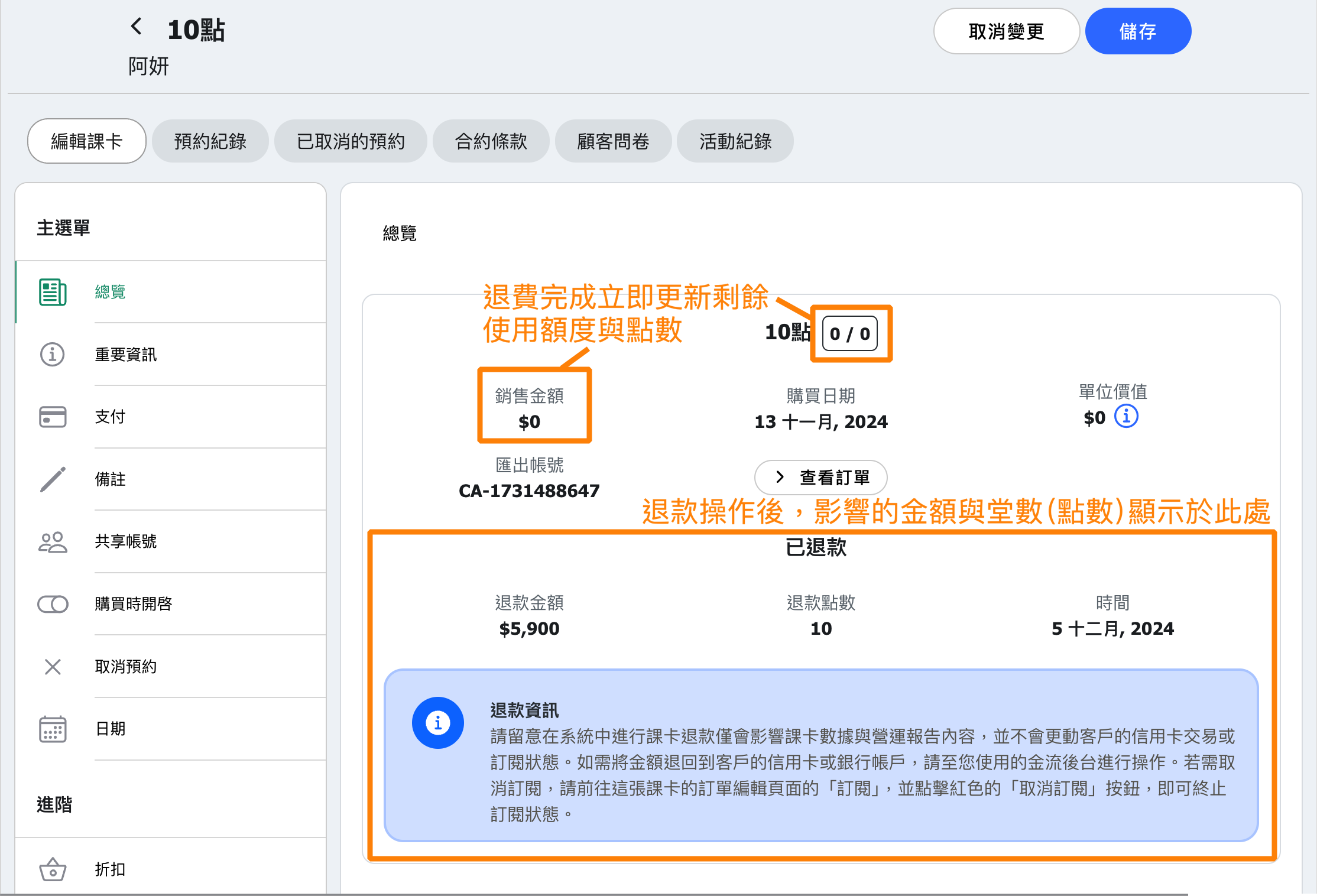 課卡總覽頁將顯示課卡為「已退款」,且不可再使用。