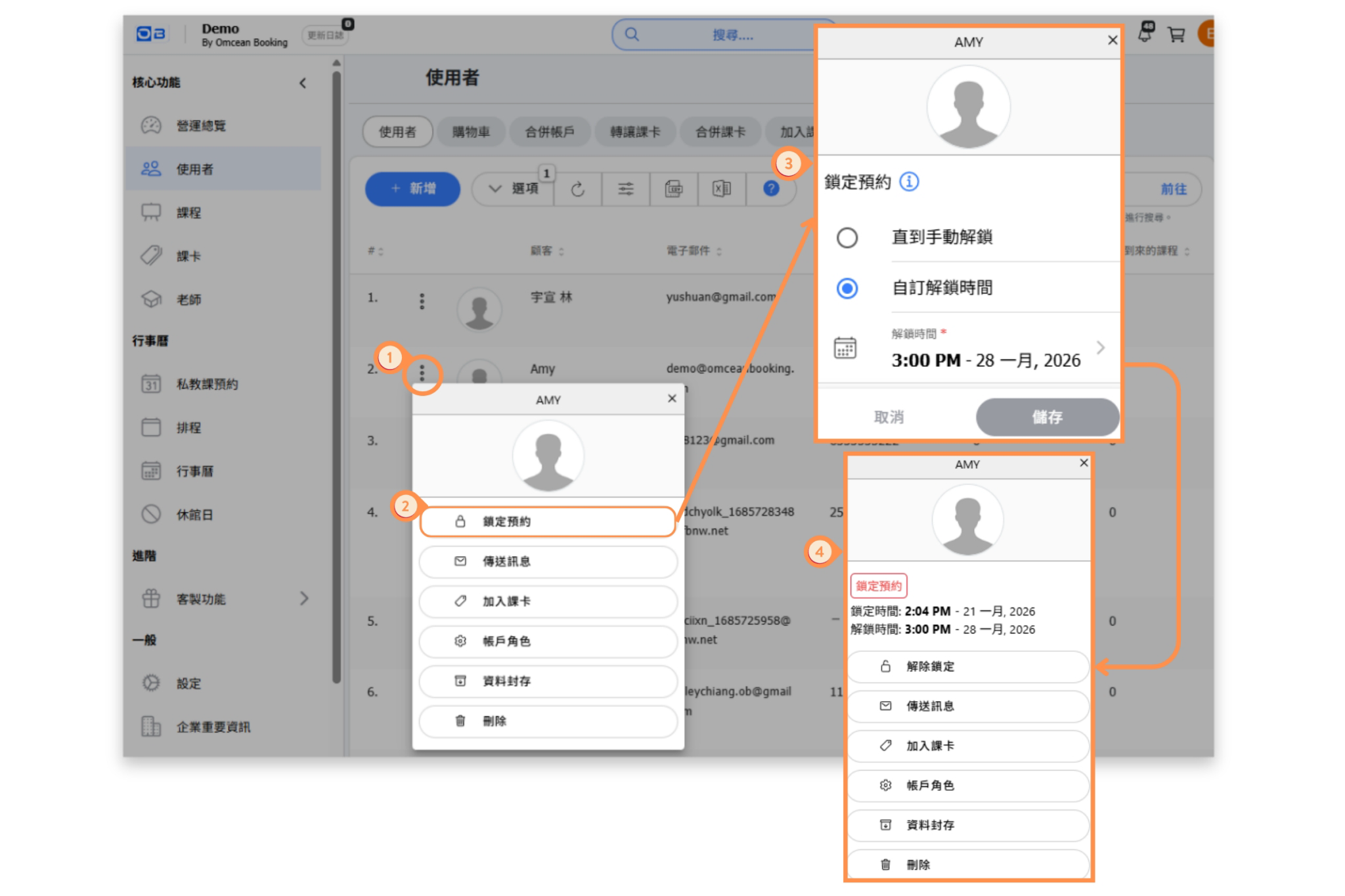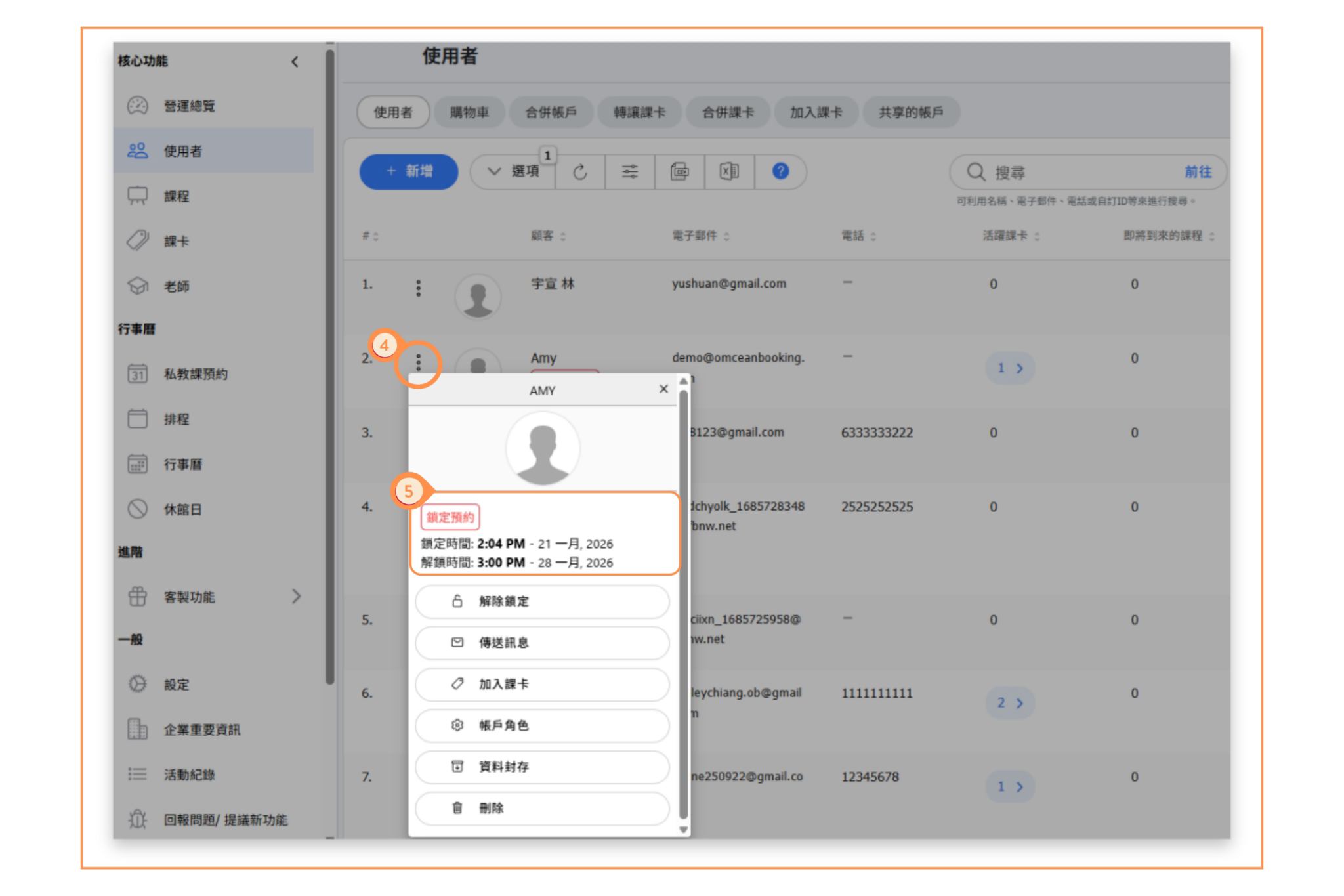 路徑:使用者 → 點擊該顧客右側「⋯」 → 解除鎖定