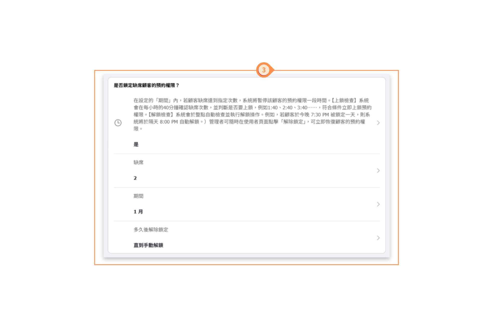 可設定在特定期間內,顧客累積缺席達一定次數後,自動鎖定其預約權限。