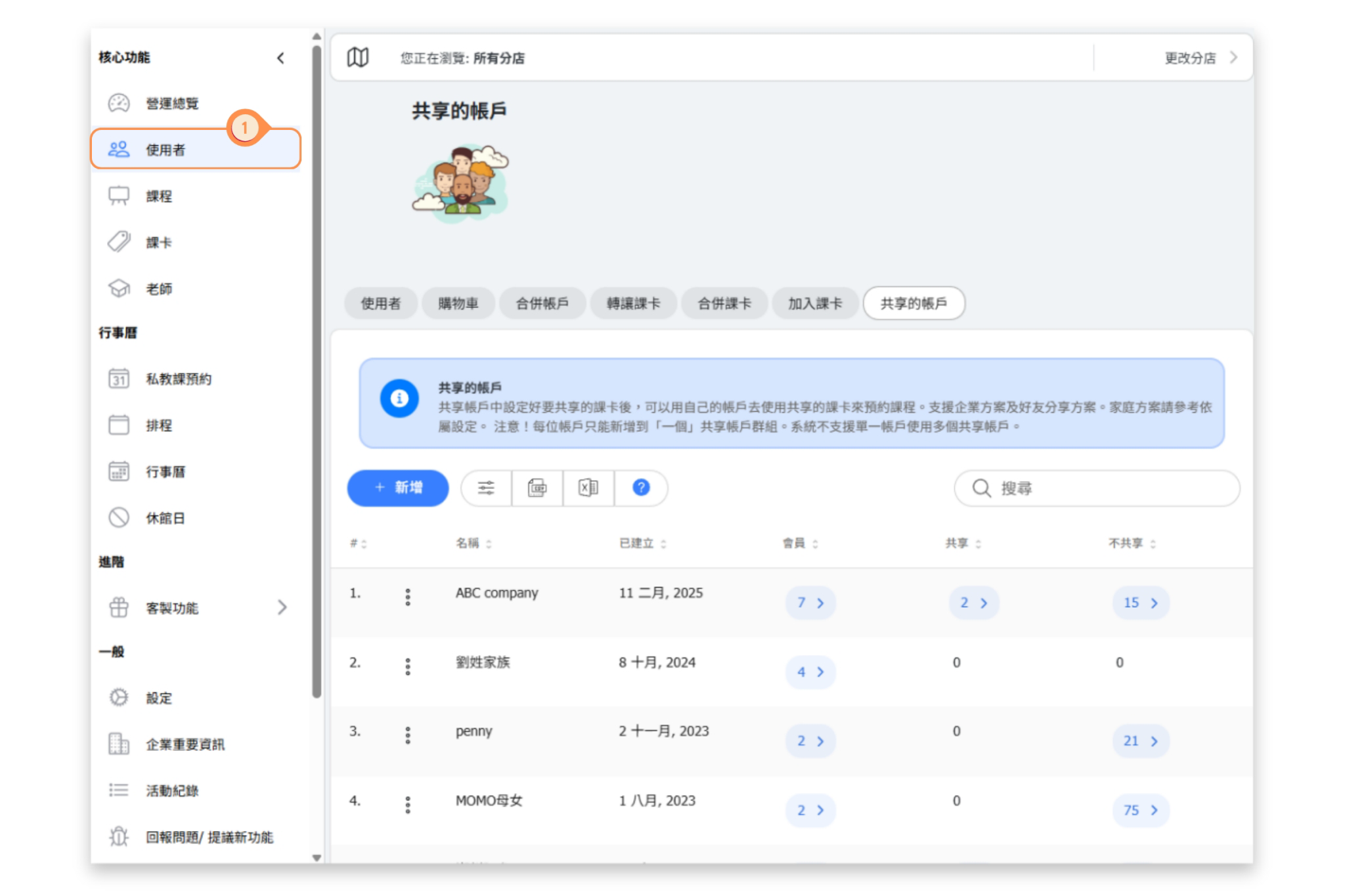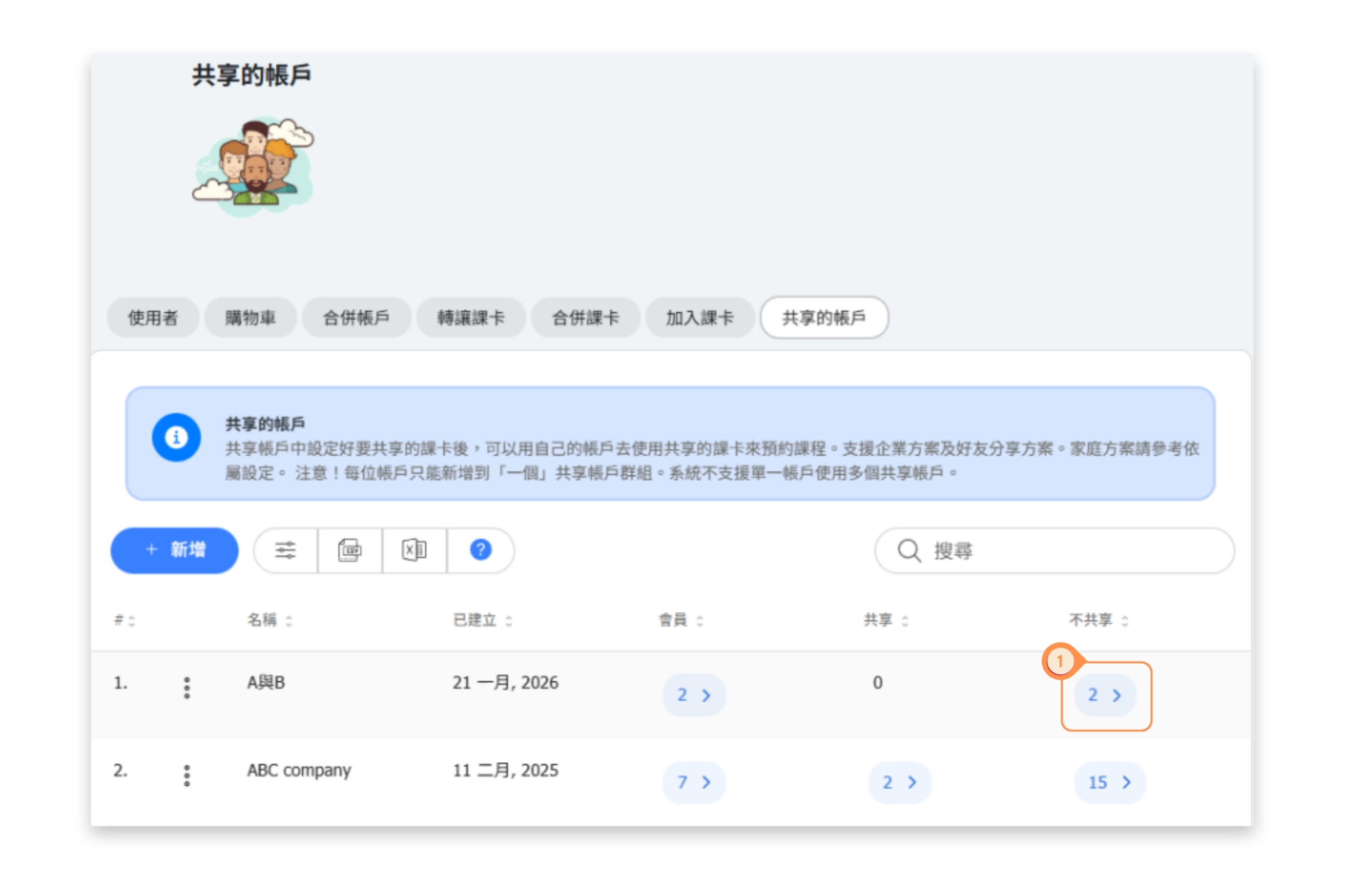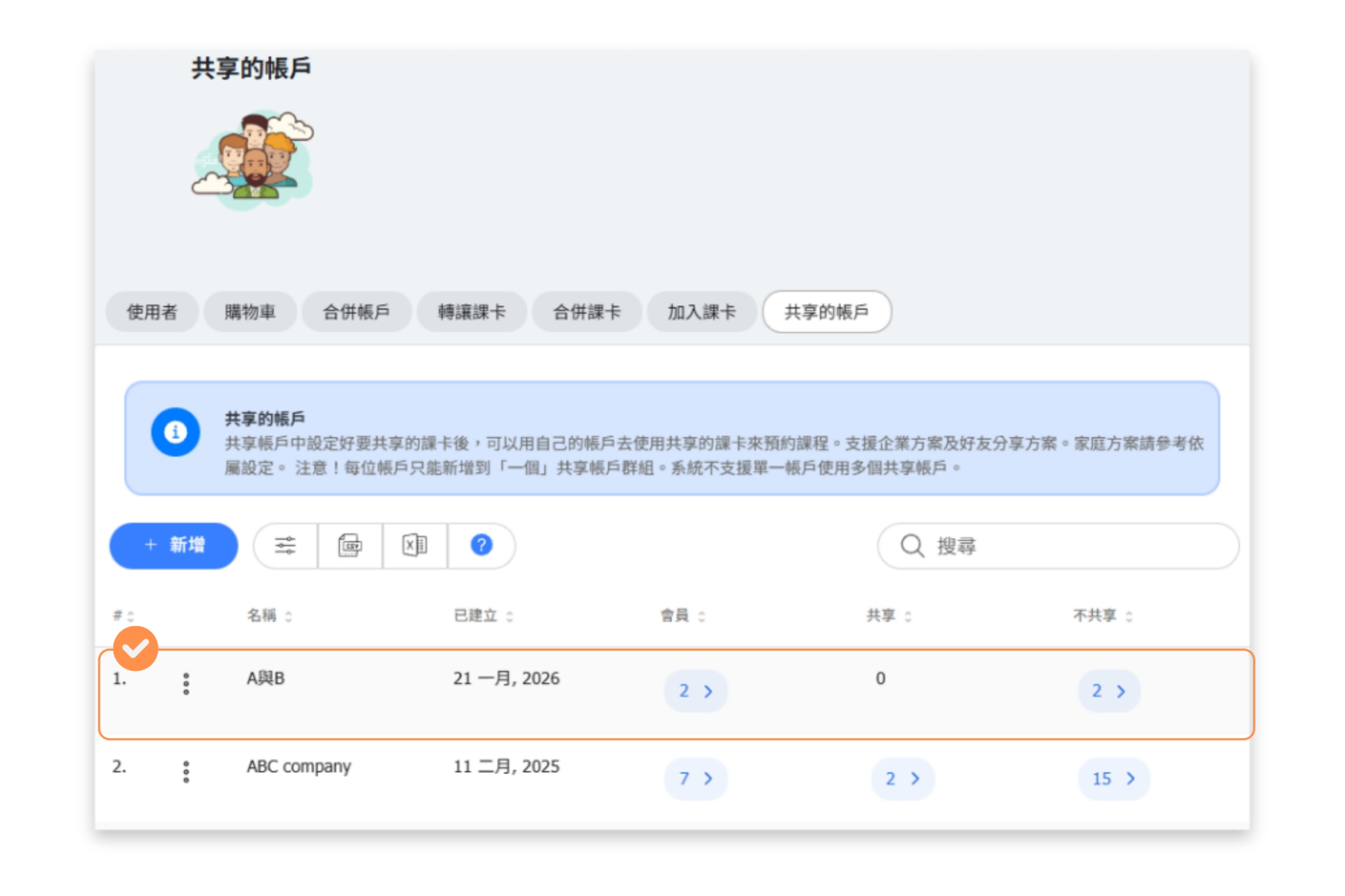 ⚠️ 系統不支援單一帳戶同時存在於多個共享帳戶群組,也不支援個別課卡共享設定。