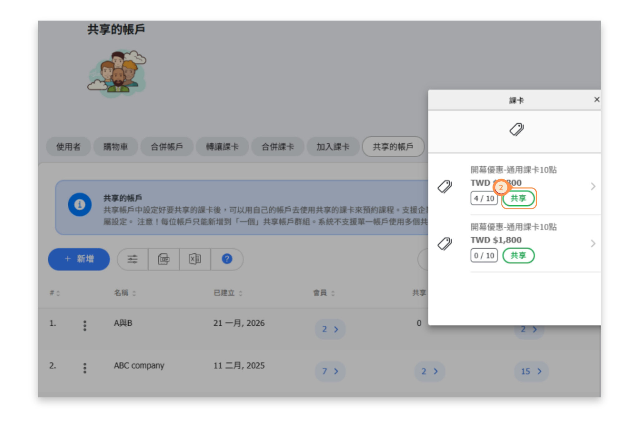 在此頁面可查看共享群組中的課卡,並在預約時直接選擇共享課卡使用。