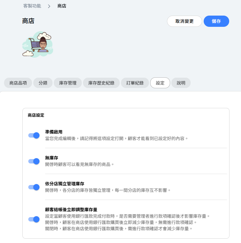 - 設定 - 配置商店設定,包括可見性和庫存選項