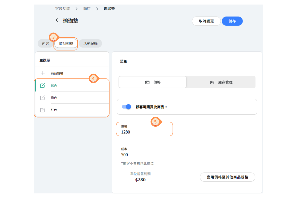 - 確保每個規格都已輸入售價