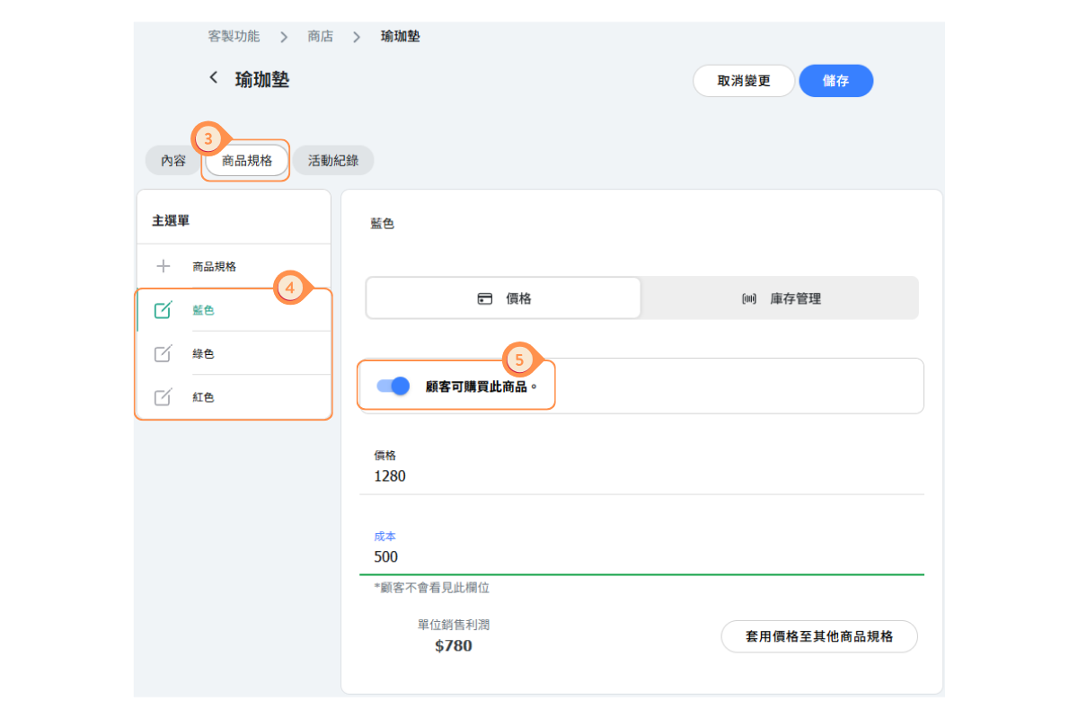 - 檢查每個規格的「顧客可購買此商品」開關是否已啟用
