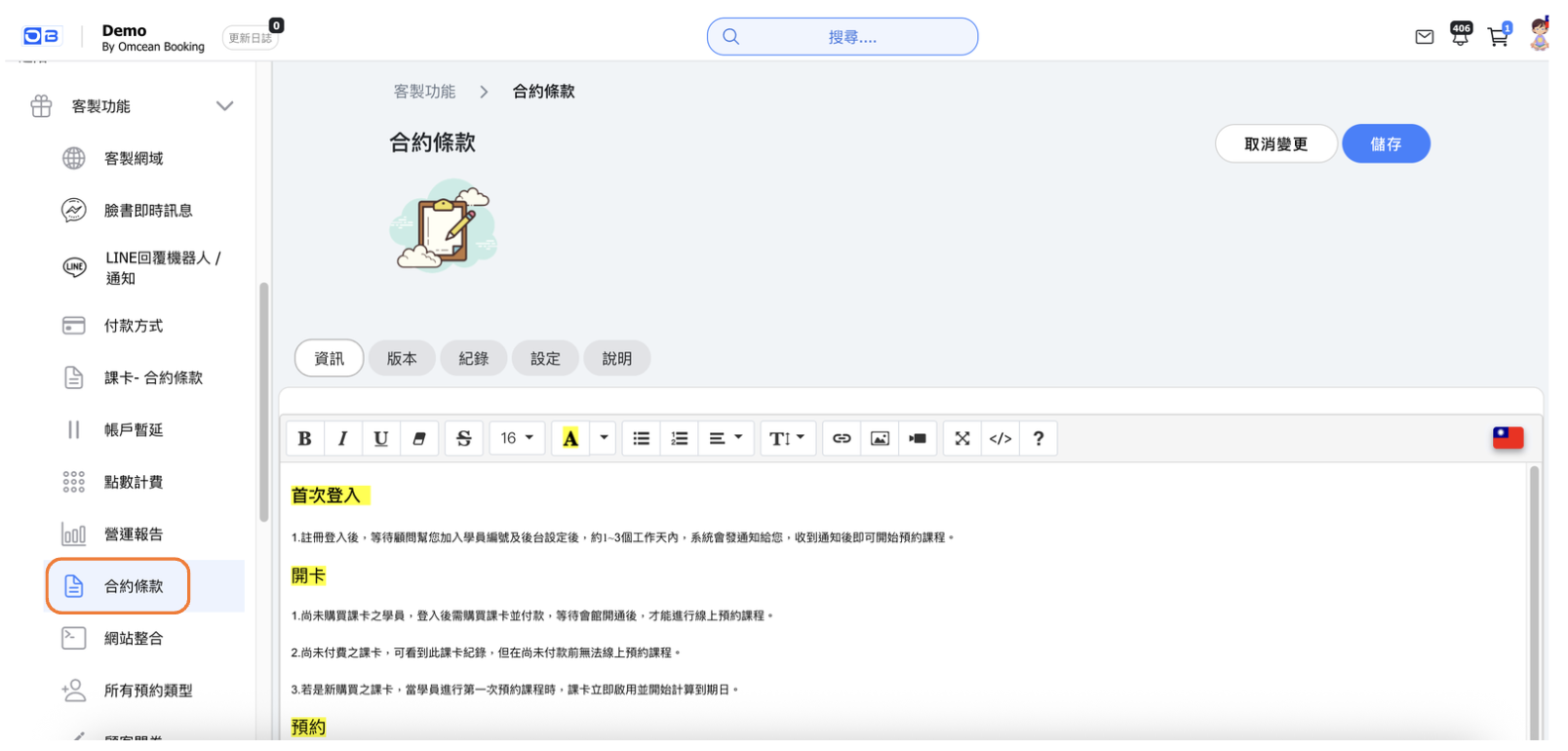 要存取合約條款,請前往左側導覽選單中的客製功能 > 合約條款。