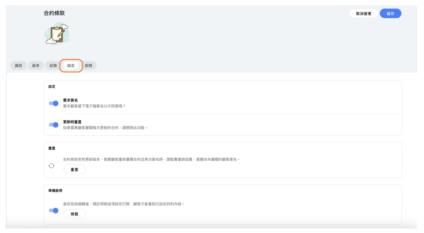 啟用後,每當您更新合約條款內容時,所有客戶都需要簽署新版本。當您進行需要客戶確認的重大政策變更時,此功能很有用。