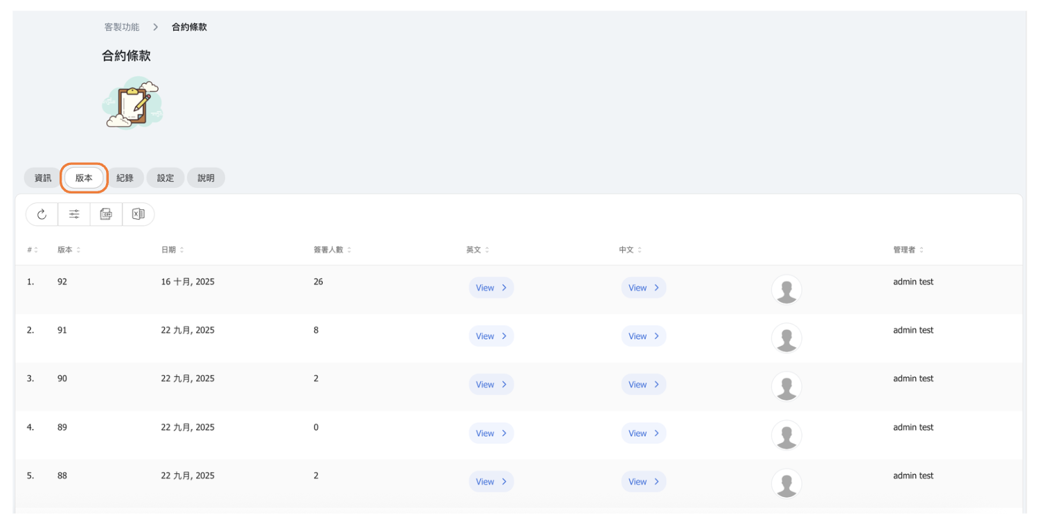 - 版本 - 查看所有先前版本的條款,包括建立日期、簽署每個版本的客戶數量,以及建立該版本的管理員。您可以查看任何先前版本的內容。