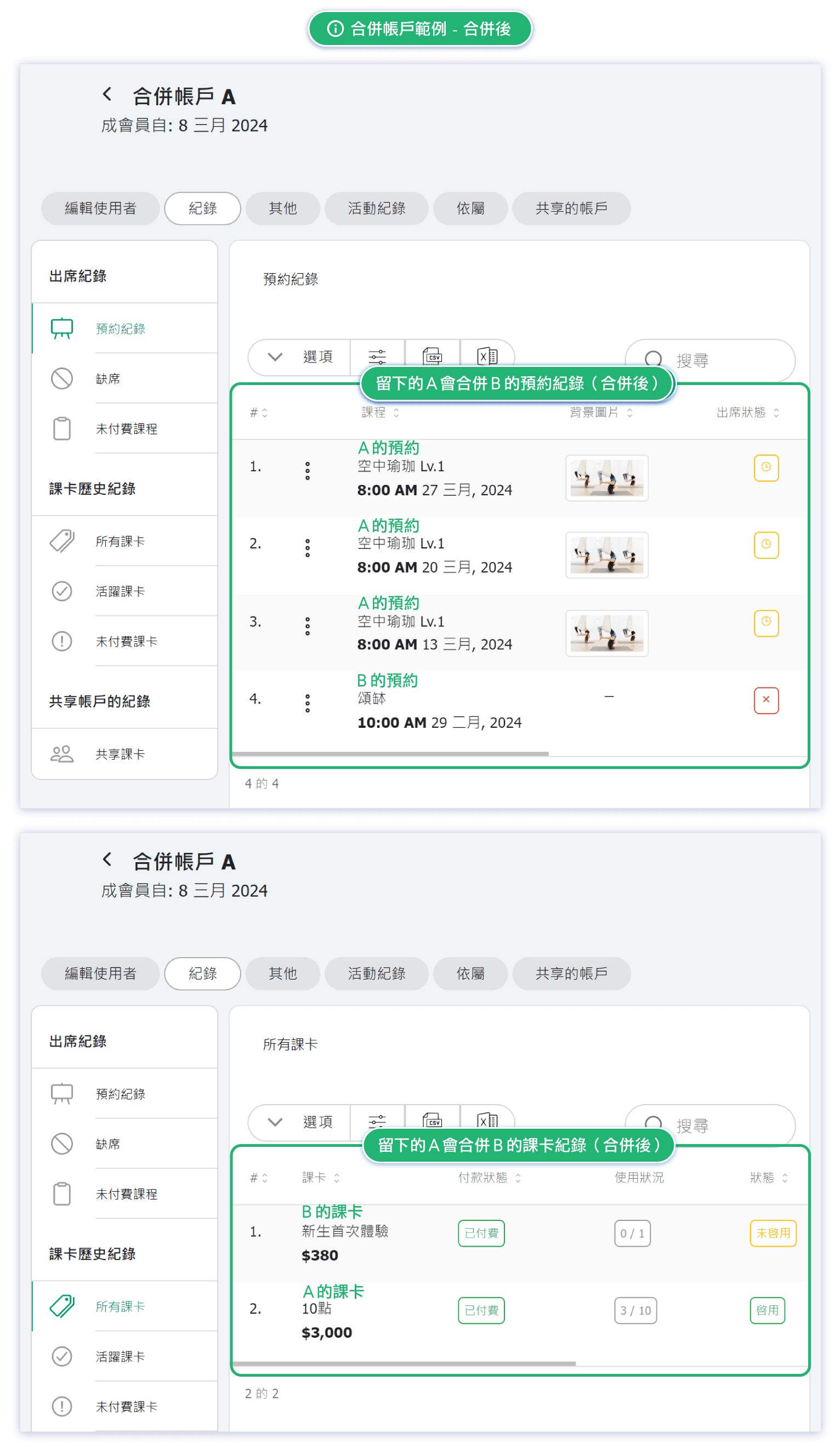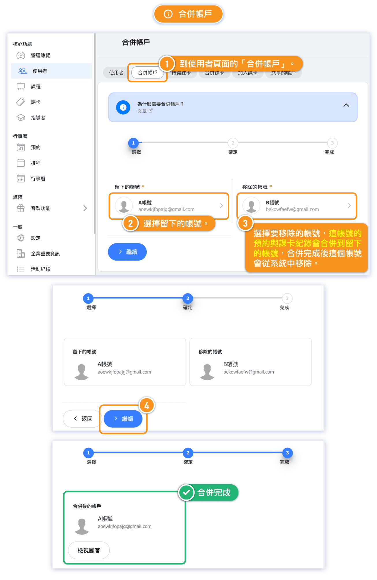 - 「預約紀錄」、「課卡紀錄」、「帳戶角色」會從移除的帳號移轉到保留的帳號。