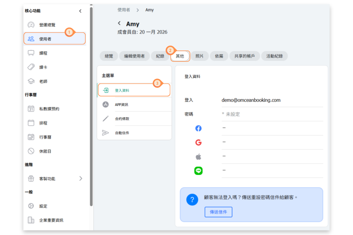 ➔解決方法 2:請後台管理者在使用者名單中協助顧客確認,在編輯使用者頁面中的【其他】→【登入資料】查詢顧客登入的方式。