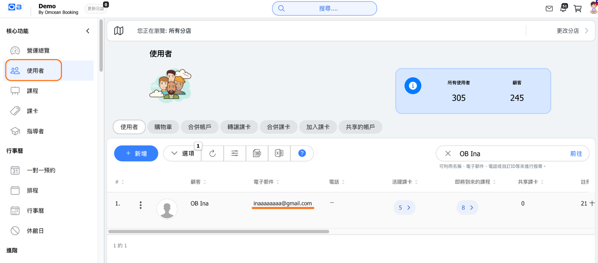 ➔解決方法:請後台管理者在使用者名單中協助顧客確認,可利用搜尋功能輸入關鍵字查詢,例如名稱、電話、電子信箱地址等。