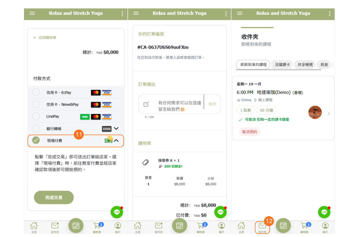 - 結帳頁面上方為購買的課卡資訊