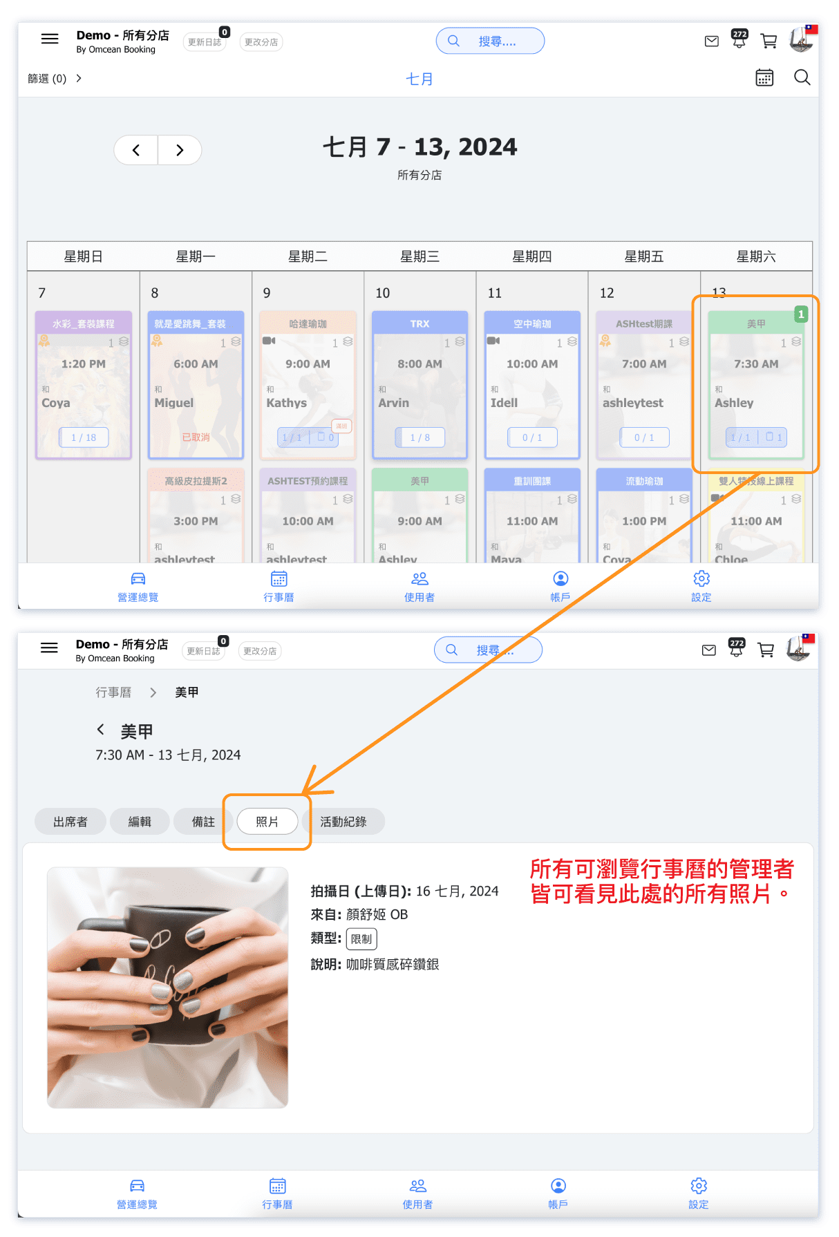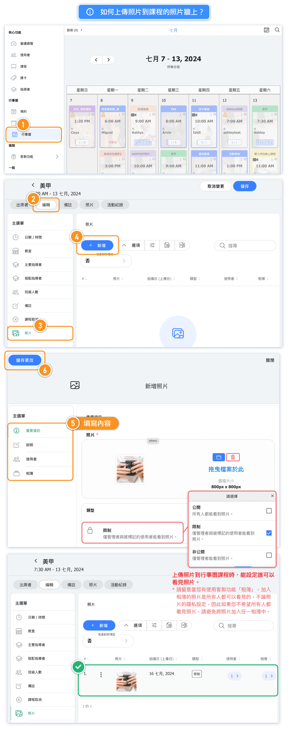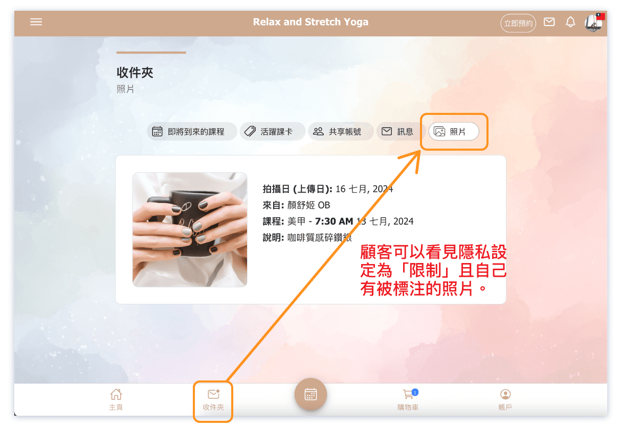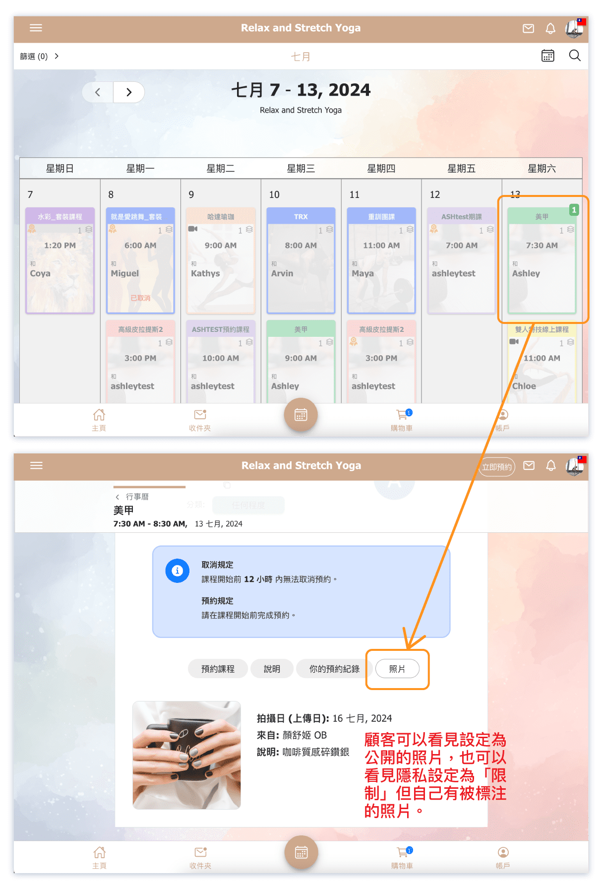 顧客可以在「行事曆」的課程資料中看見設定為公開的照片,也可以看見隱私設定為「限制」但自己有被標注的照片。