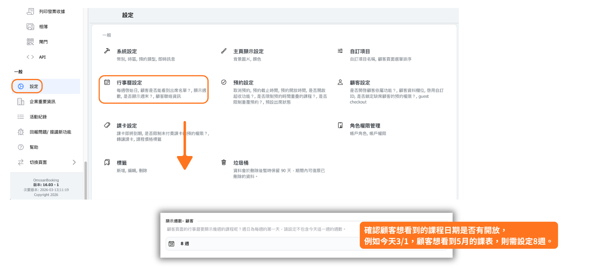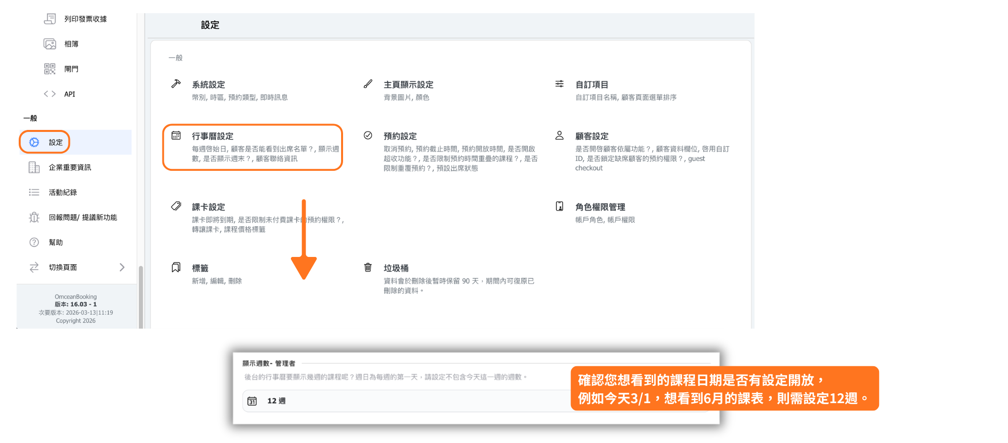 1. 行事曆設定的「顯示週數 - 顧客」尚未開放到一定的日期。